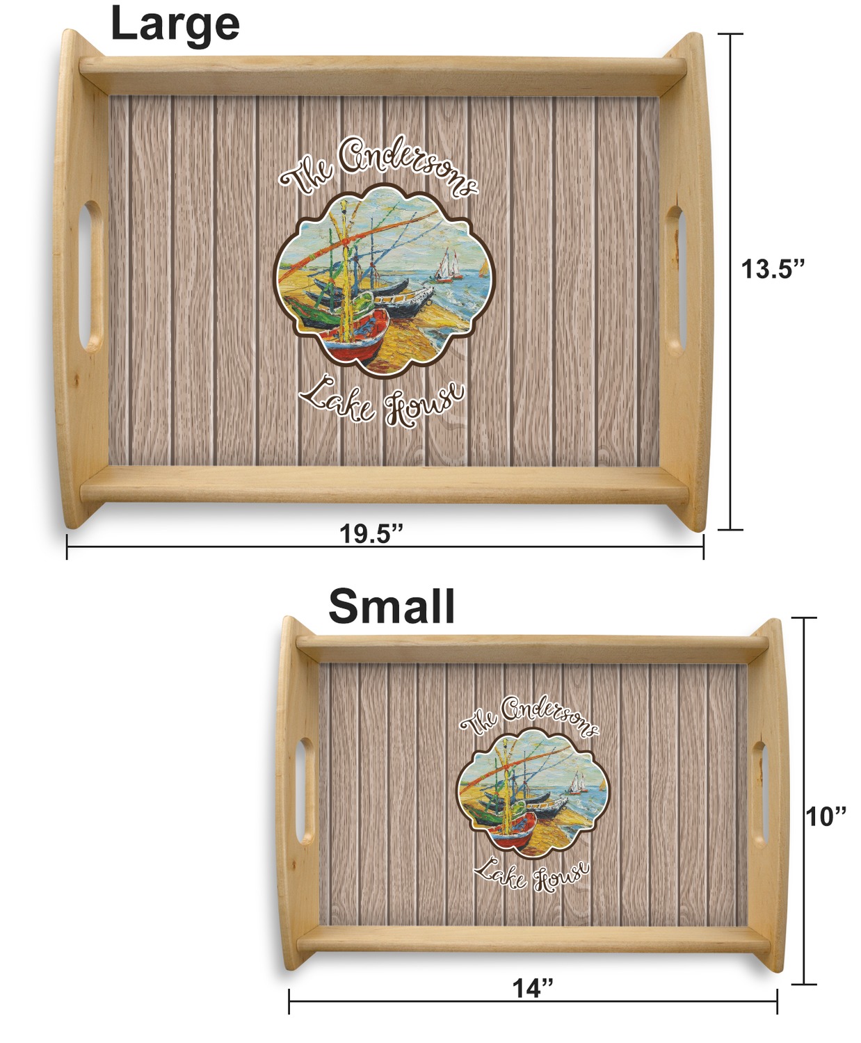 This serving tray with handles features square edges and two rounded sides, creating a very modern look. Each side is fabricated from a beautifully cut, natural wood. The bottom of the interior of the tray displays your customized design in bright, vibrant color. The tray is sold in both a black color and a natural wood look. Each variation of the wood serving tray has two sizes: Small, which is 14" x 10" x 2.25", and Large, which is 19.5" x 13.5" x 2.75".