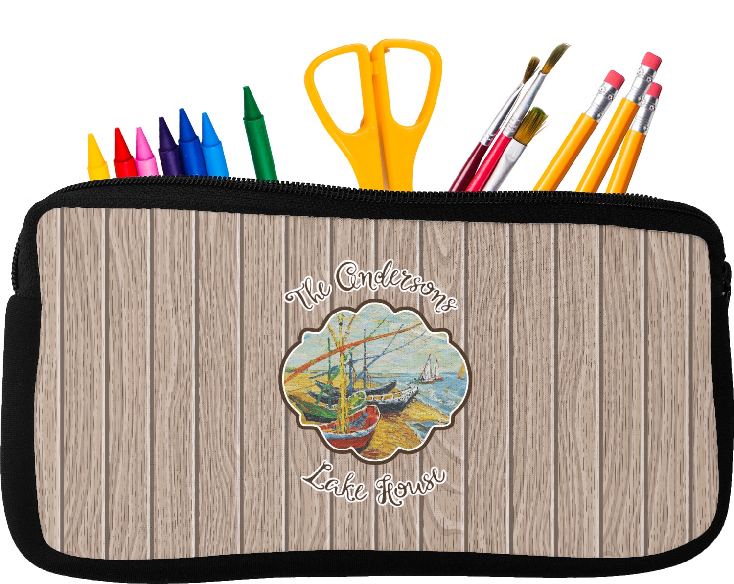 Built from durable neoprene, these pencil pouches, are water resistant, and prevent leaking ink from spilling into your backpack or purse. These custom pencil cases secure with a robust, black zipper. We print your personalized design on the front of this pouch, while the remaining sides a simple black color. These colored pencil cases [880] are sold in two sizes; our smaller version measures at 8.5 by 4.5 inches, while the medium measures at 10.5 by 6.5 inches. The smaller size is more suitable for holding pencils and pens, while our medium size can accommodate pencil sharpeners, scissors, and erasers.