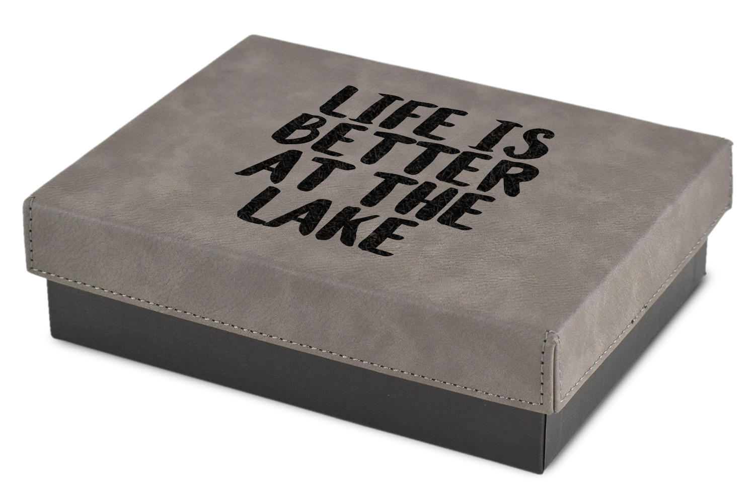 These gift boxes are available in 3 different sizes to accommodate various sized gifts. Available in gray as a neutral color for any occasion as well as to showcase your design boldly. Engraved with a laser this high quality paper board and faux leather gift box is unique and makes any gift stand out.