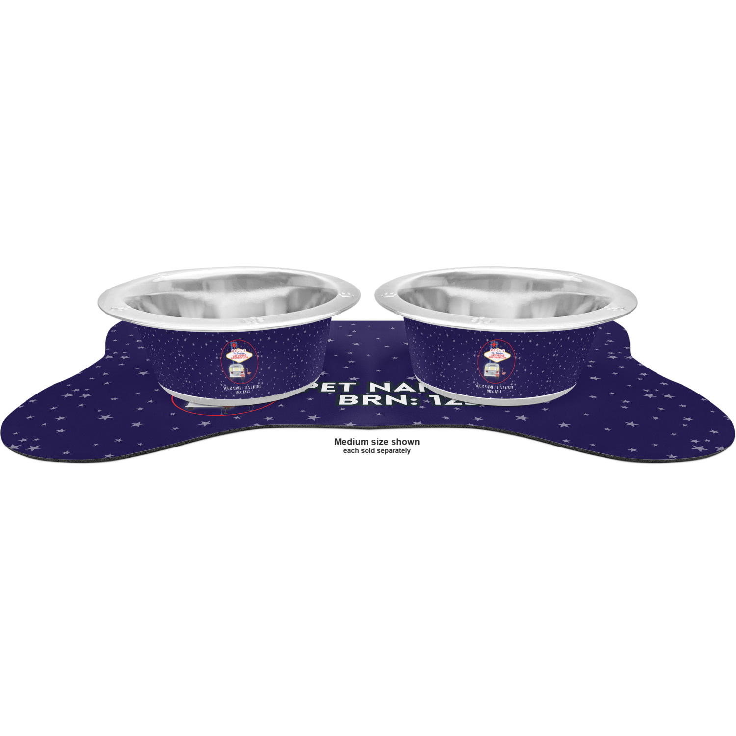 The top of this mat displays your custom design, as it is printed on polyester. To prevent slippage, the underside of the mat is made of rubber. We offer a small dog food mat, suitable for smaller dogs and a large dog food mat for bigger breeds. The small dog food mat is approximately 19 by 13 inches, while the large dog feeding mat measures at approximately 26.75 by 18 inches. Both personalized mats are ideally sized to fit two dog bowls.