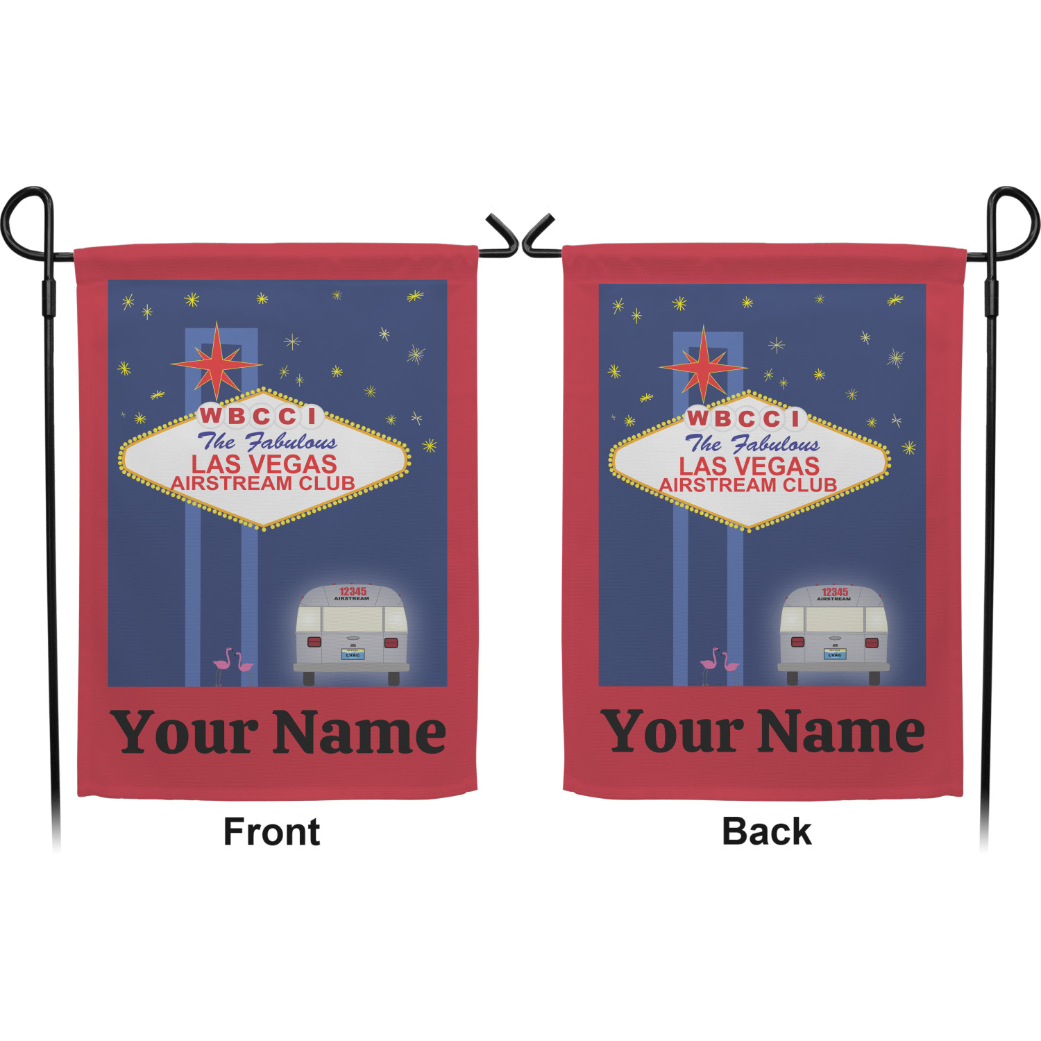 These custom garden flags are made of a durable, double-ply, polyester weave, allowing them to withstand the elements year round. The small flags measure at approximately 12 by 18 inches. The large flags measure out to 28 by 37 inches. You can order these decorative flags with your customization printed on the front only, or the front and back.