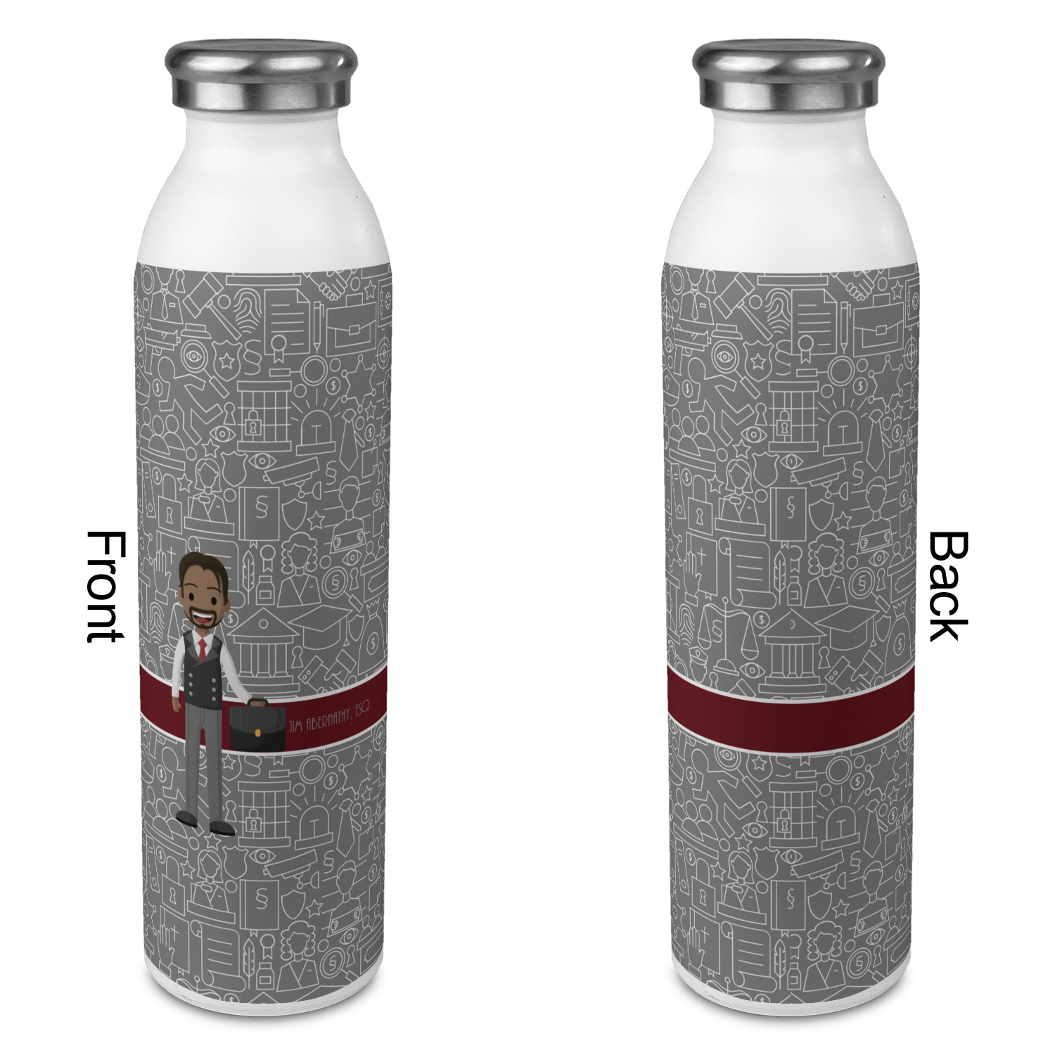 The background has fun attorney / law icons and is grey and white. The main feature of this design is a well dressed avatar of your choosing! You can upload your own or customize ours; you are able to customize the skin tone and hair color to fit what you like! There are also several different avatars / characters in the system to choose from with different hair and body types. Easily put your name or text right next to your avatar to finish off your awesome design.