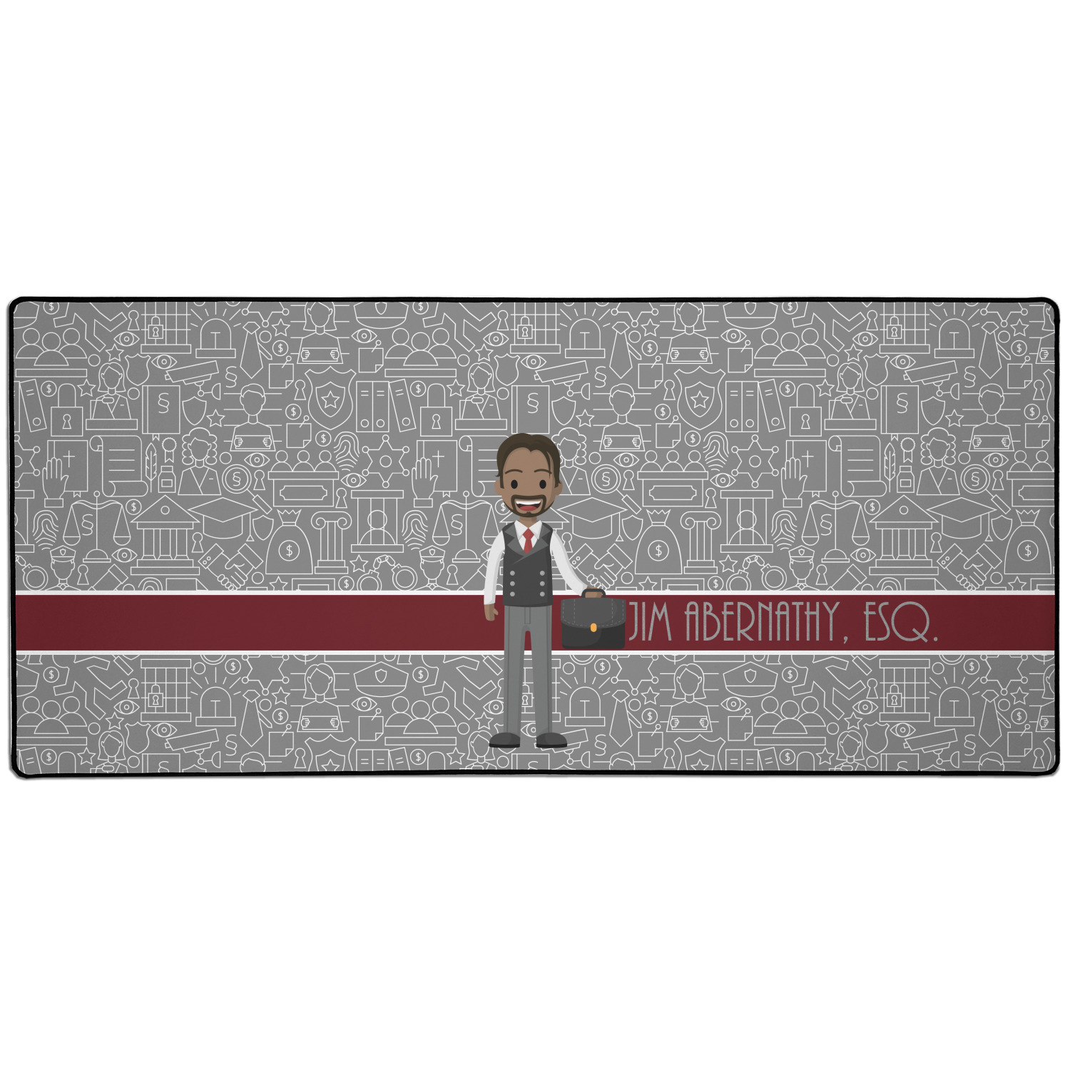 The background has fun attorney / law icons and is grey and white. The main feature of this design is a well dressed avatar of your choosing! You can upload your own or customize ours; you are able to customize the skin tone and hair color to fit what you like! There are also several different avatars / characters in the system to choose from with different hair and body types. Easily put your name or text right next to your avatar to finish off your awesome design.