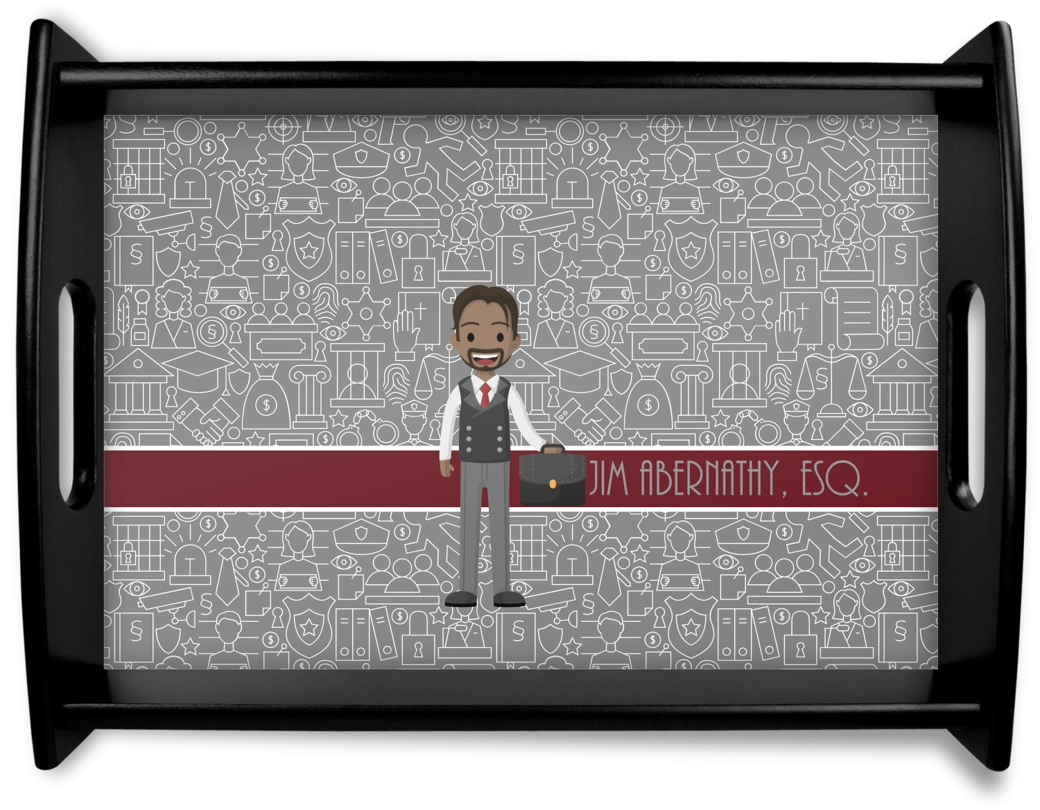 This serving tray with handles features square edges and two rounded sides, creating a very modern look. Each side is fabricated from a beautifully cut, natural wood. The bottom of the interior of the tray displays your customized design in bright, vibrant color. The tray is sold in both a black color and a natural wood look. Each variation of the wood serving tray has two sizes: Small, which is 14" x 10" x 2.25", and Large, which is 19.5" x 13.5" x 2.75".