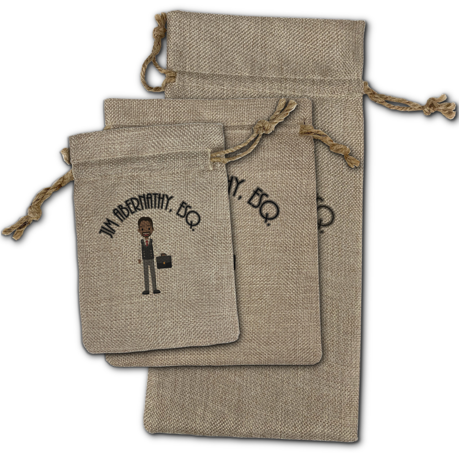 We sell our Burlap Gift Bags in 3 variant sized bags. Made with burlap polyester, each personalized bag can be secured with a twine drawstring pull. Your custom design is available to print on one side or both sides - completely up to you! The sizes of the bags measure approximately 4.5" x 6.5" for the smallest size, 6.5" x 8.0" for the medium size, and 6.5" x 13.5" for the large-sized bag.