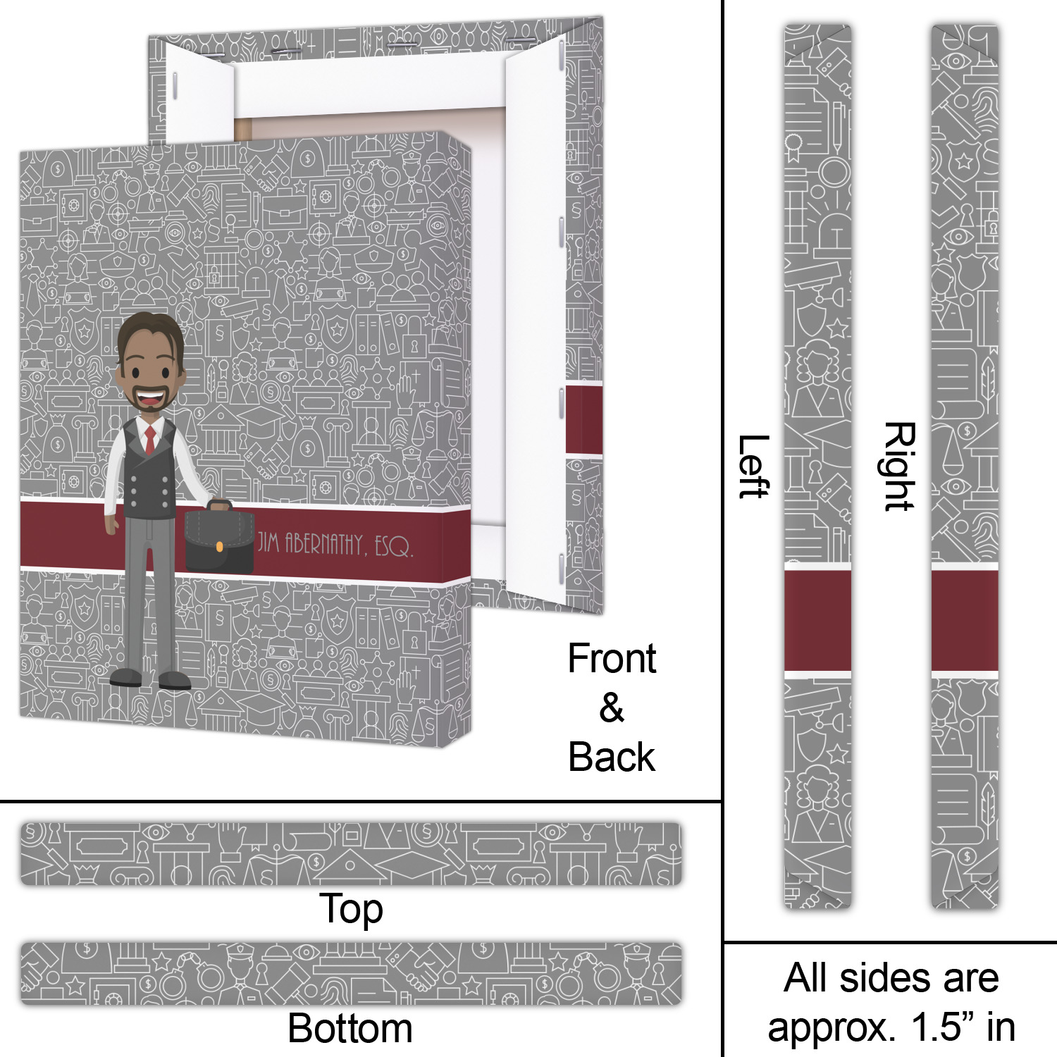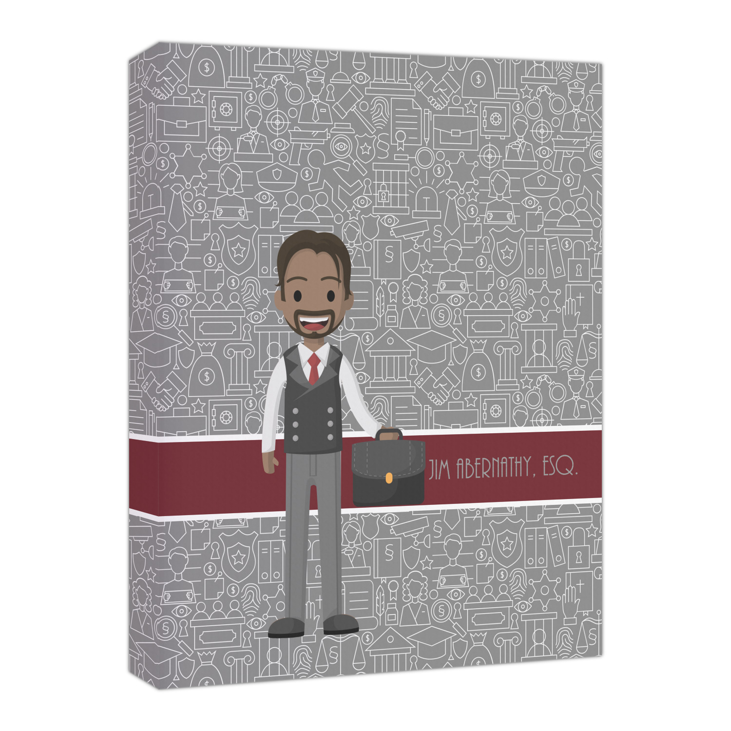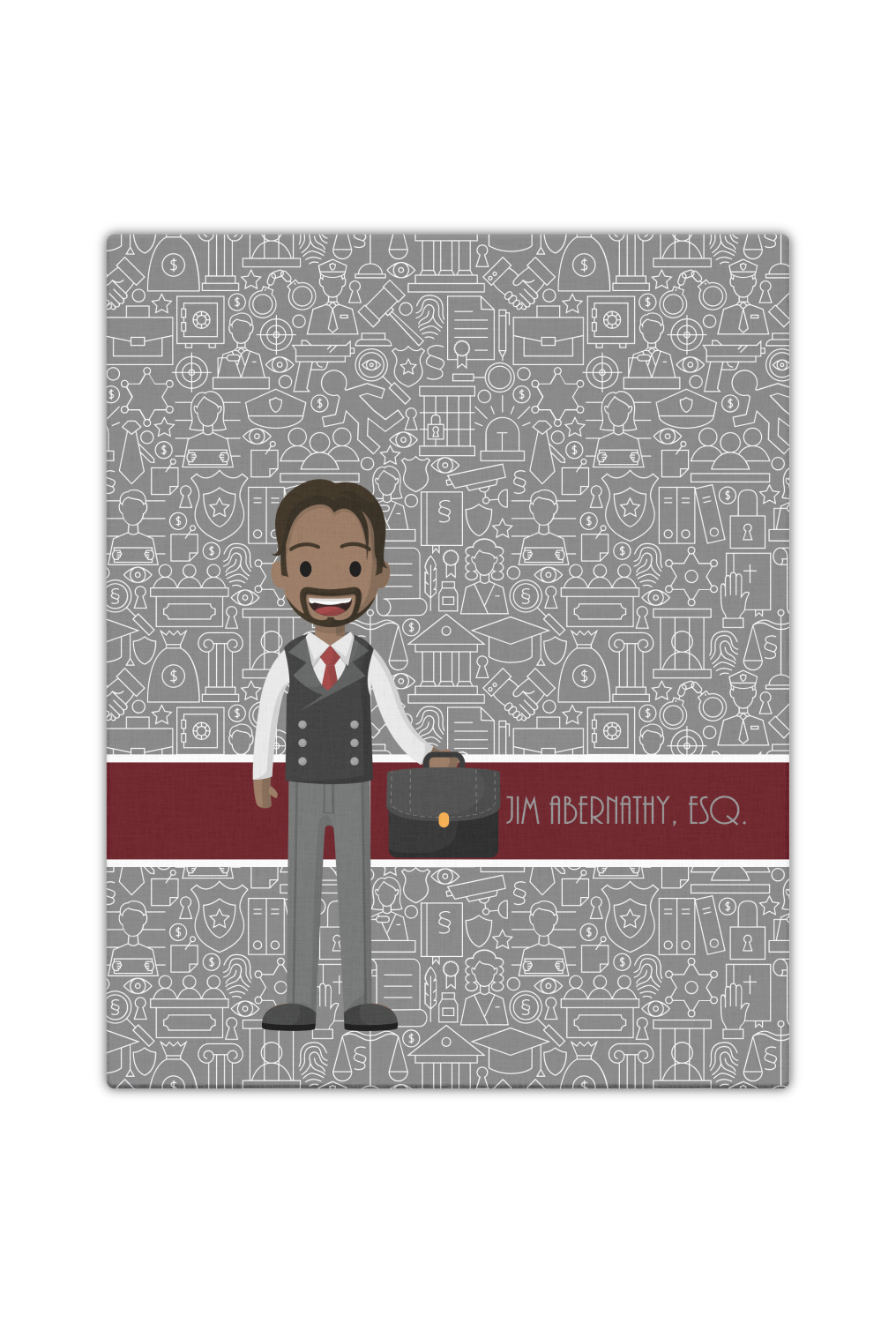 The background has fun attorney / law icons and is grey and white. The main feature of this design is a well dressed avatar of your choosing! You can upload your own or customize ours; you are able to customize the skin tone and hair color to fit what you like! There are also several different avatars / characters in the system to choose from with different hair and body types. Easily put your name or text right next to your avatar to finish off your awesome design.