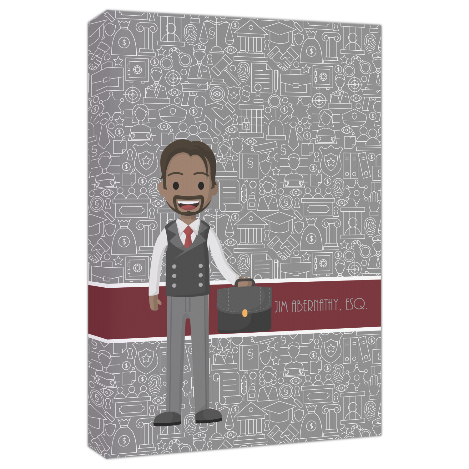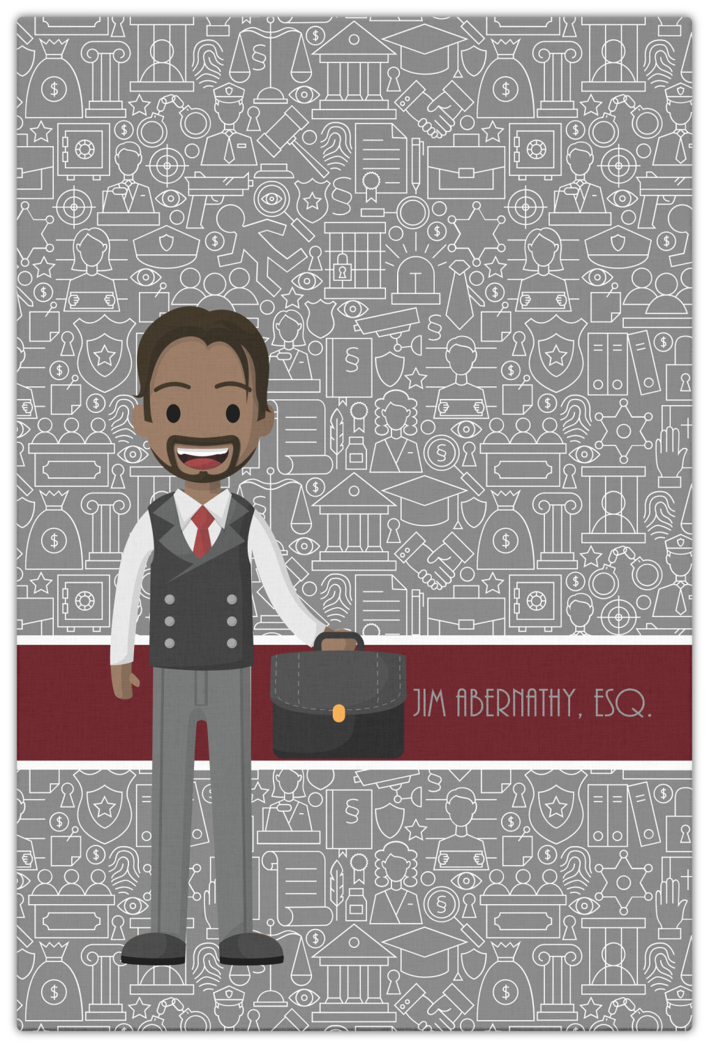 The background has fun attorney / law icons and is grey and white. The main feature of this design is a well dressed avatar of your choosing! You can upload your own or customize ours; you are able to customize the skin tone and hair color to fit what you like! There are also several different avatars / characters in the system to choose from with different hair and body types. Easily put your name or text right next to your avatar to finish off your awesome design.