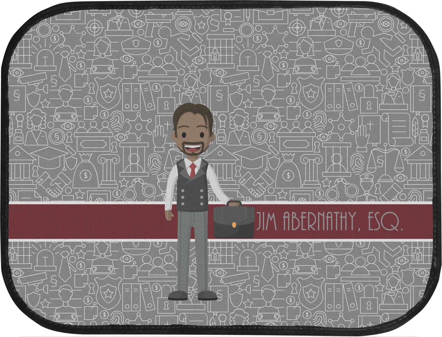 The background has fun attorney / law icons and is grey and white. The main feature of this design is a well dressed avatar of your choosing! You can upload your own or customize ours; you are able to customize the skin tone and hair color to fit what you like! There are also several different avatars / characters in the system to choose from with different hair and body types. Easily put your name or text right next to your avatar to finish off your awesome design.