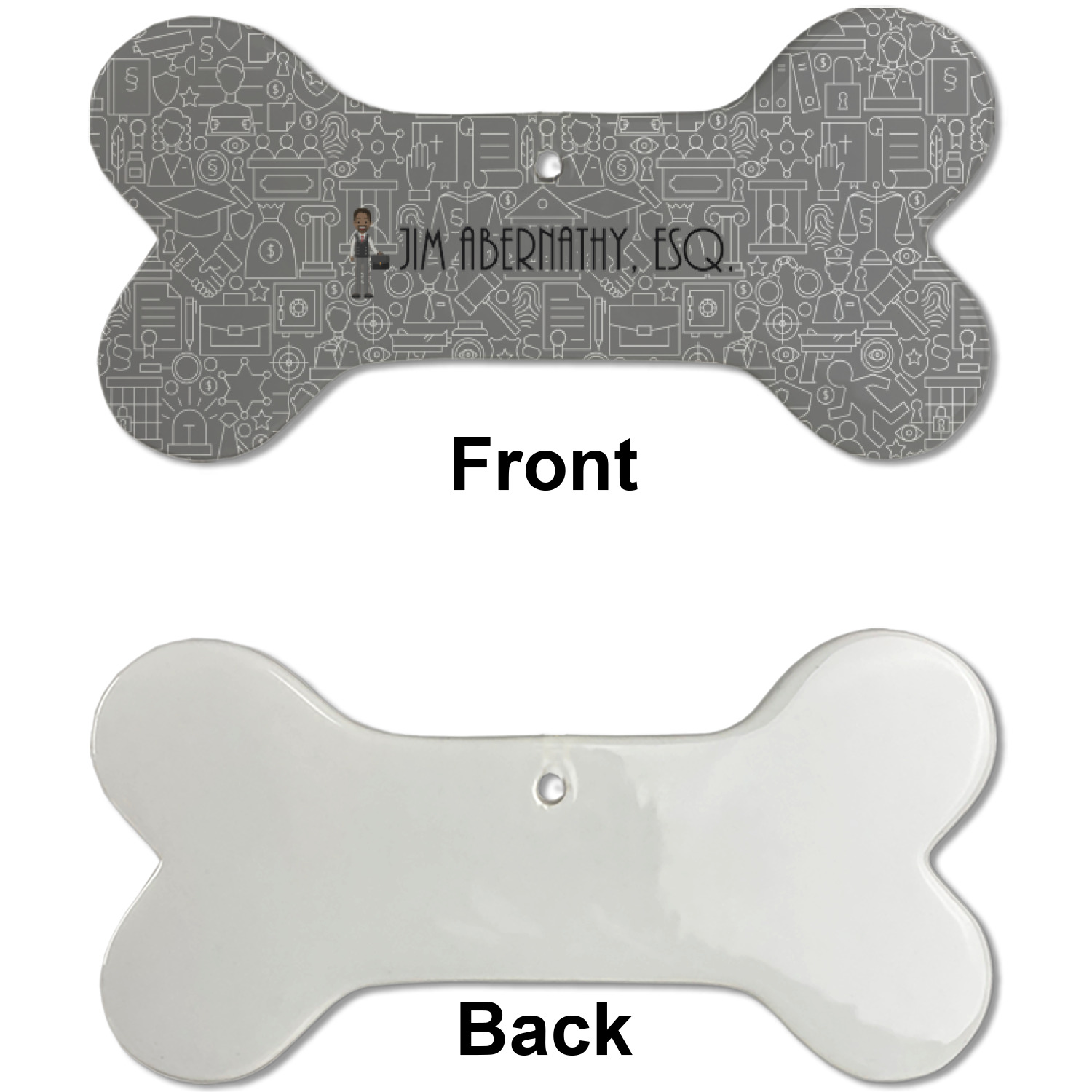 Our dog Christmas ornaments are a ceramic material with a bone-shaped structure hung horizontally. We offer two printing styles to personalize your furry friend's ornament! Choose a one-sided printing, perfect for wall decor, memorial accessory, or doghouse nameplate! Create a double-sided ornament perfect for adorning the Christmas tree. Each dog bone ornament is approximately 4.75" x 2.25" and is printed here in the USA.