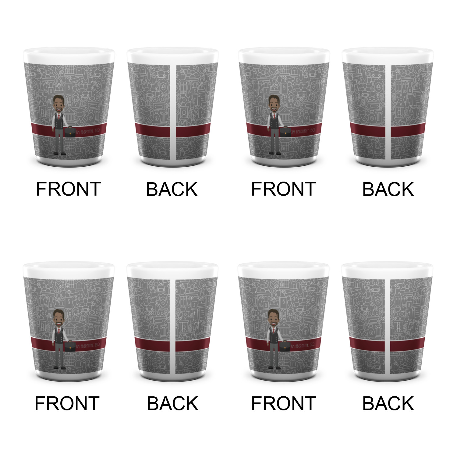 Made from ceramic these shot glasses are printed in full color with the design of your choice. These are a standard 1.5oz size and stand 2.25" tall. Available in a full white ceramic or a two-tone with a black color inside the shot glass. Buy a single or a set of 4, all of which can be designed separately to get you just what you want and need.