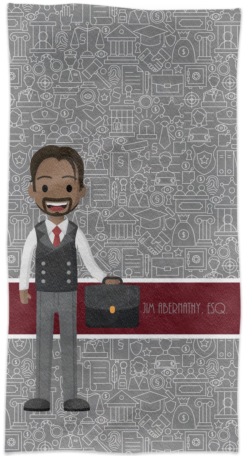 The background has fun attorney / law icons and is grey and white. The main feature of this design is a well dressed avatar of your choosing! You can upload your own or customize ours; you are able to customize the skin tone and hair color to fit what you like! There are also several different avatars / characters in the system to choose from with different hair and body types. Easily put your name or text right next to your avatar to finish off your awesome design.