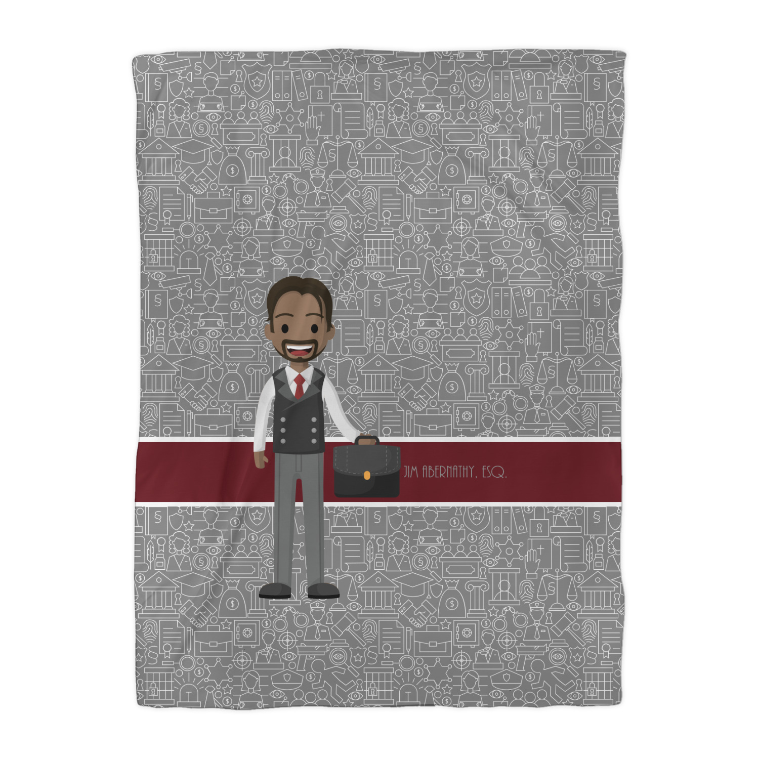 The background has fun attorney / law icons and is grey and white. The main feature of this design is a well dressed avatar of your choosing! You can upload your own or customize ours; you are able to customize the skin tone and hair color to fit what you like! There are also several different avatars / characters in the system to choose from with different hair and body types. Easily put your name or text right next to your avatar to finish off your awesome design.