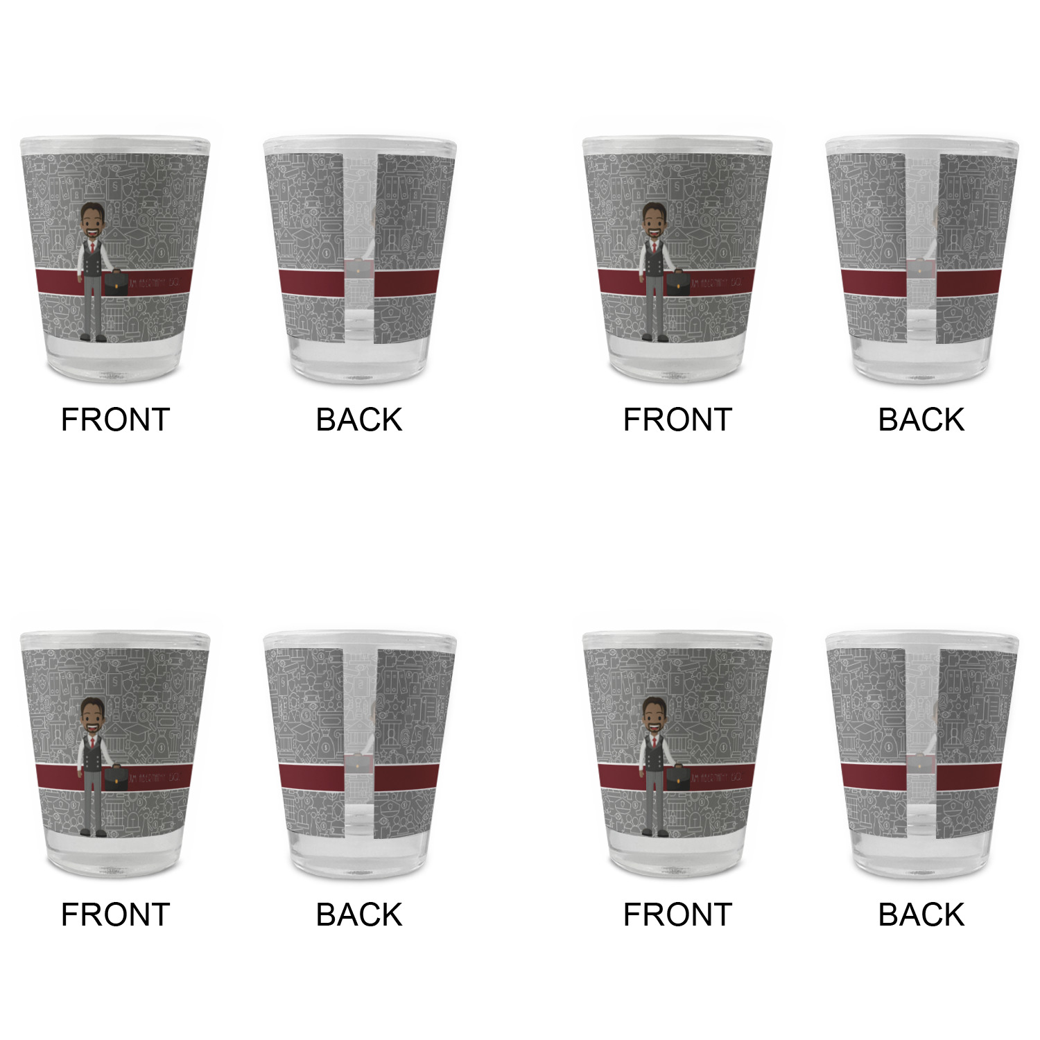 Made with frosted glass, these shot glasses are printed in full color with the design of your choice. They are a standard 1.5oz shot glass and are 2.4" tall. The print is wrapped around the shot glass in a full wrap and boldly displays your customization.