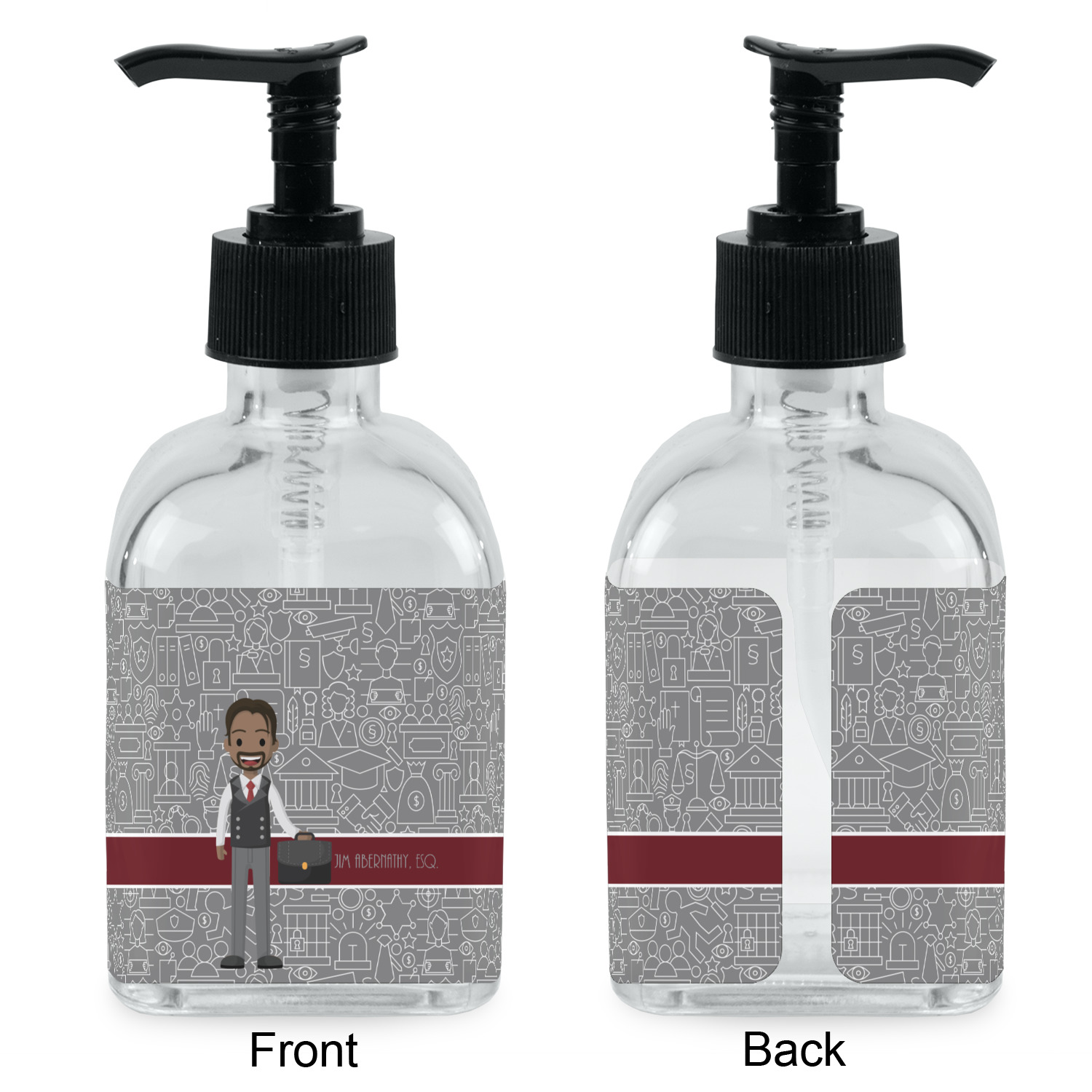 Crafted from a high-quality glass, these soap dispensers and lotion dispensers are durable and robust, while still looking elegant. They are sold with black pumps. Each soap dispenser pump measures at 6.5 by 2.25 inches. On these soap pumps, we display your customized design on a personalized vinyl adhesive on three sides. That way, you can judge how much liquid is in the bottles from the back.