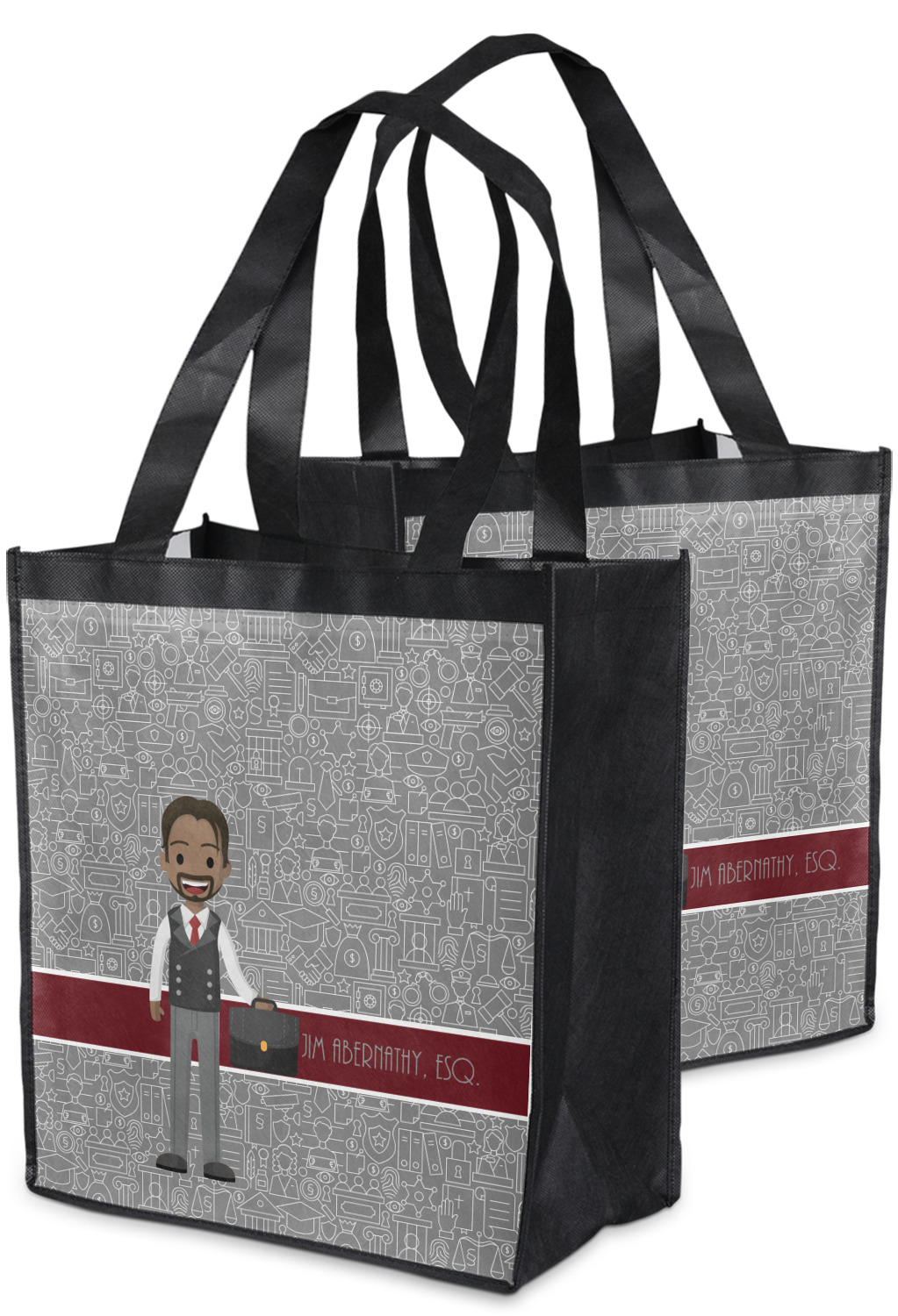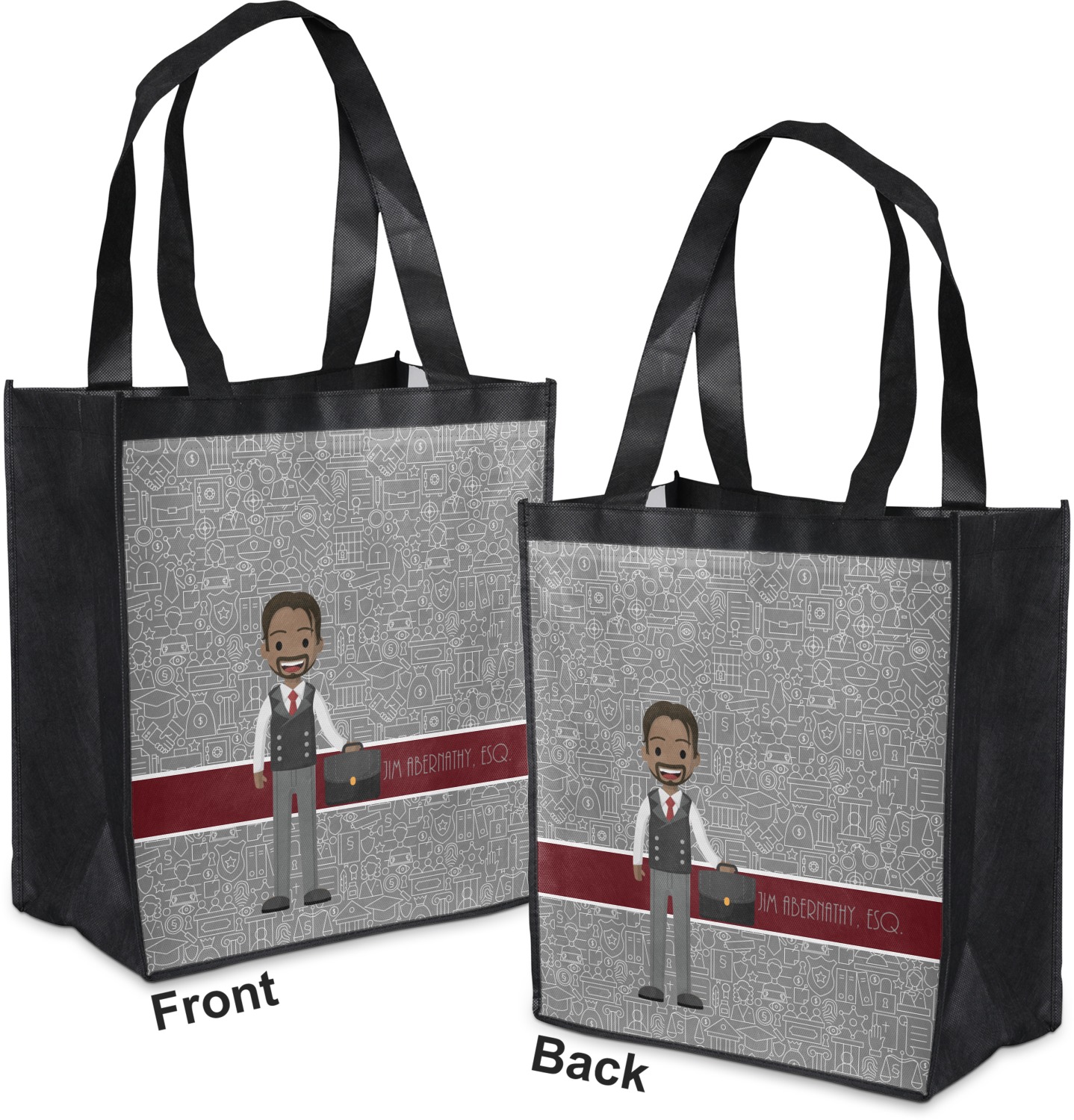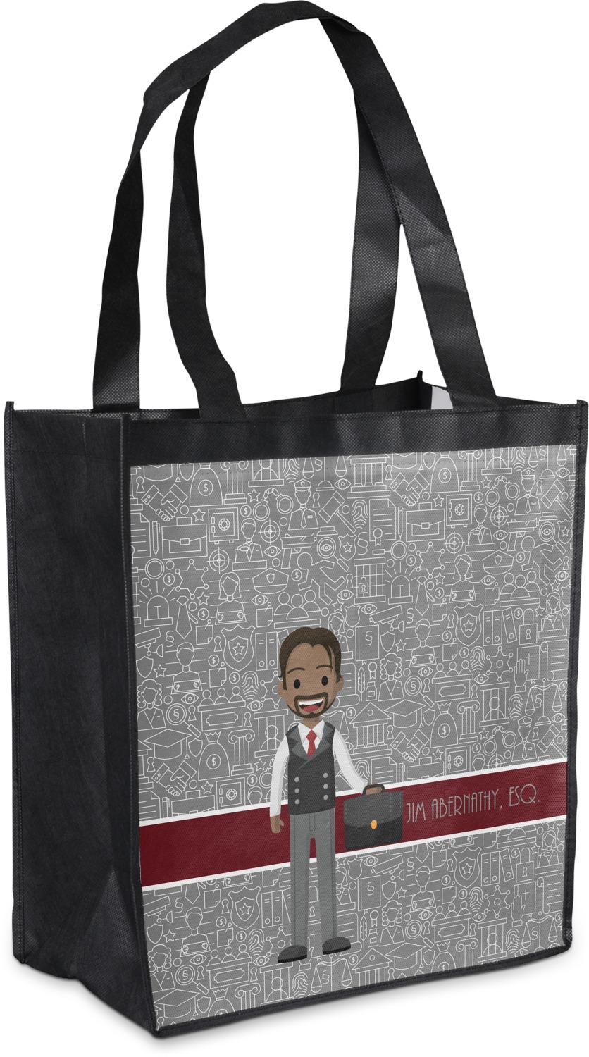 Made from a durable, biodegradable material, these reusable shopping bags can support up to 30 pounds of weight. With two large handles, measuring at 8.5 inches each, these personalized tote bags are easy to carry to your vehicle or home. The bag itself is 12 by 13.5 inches, and can expand to a depth of 7 inches. Your customization is printed on both the front and back, while the remaining sides, trim, and handle are a sleek, charcoal black.
