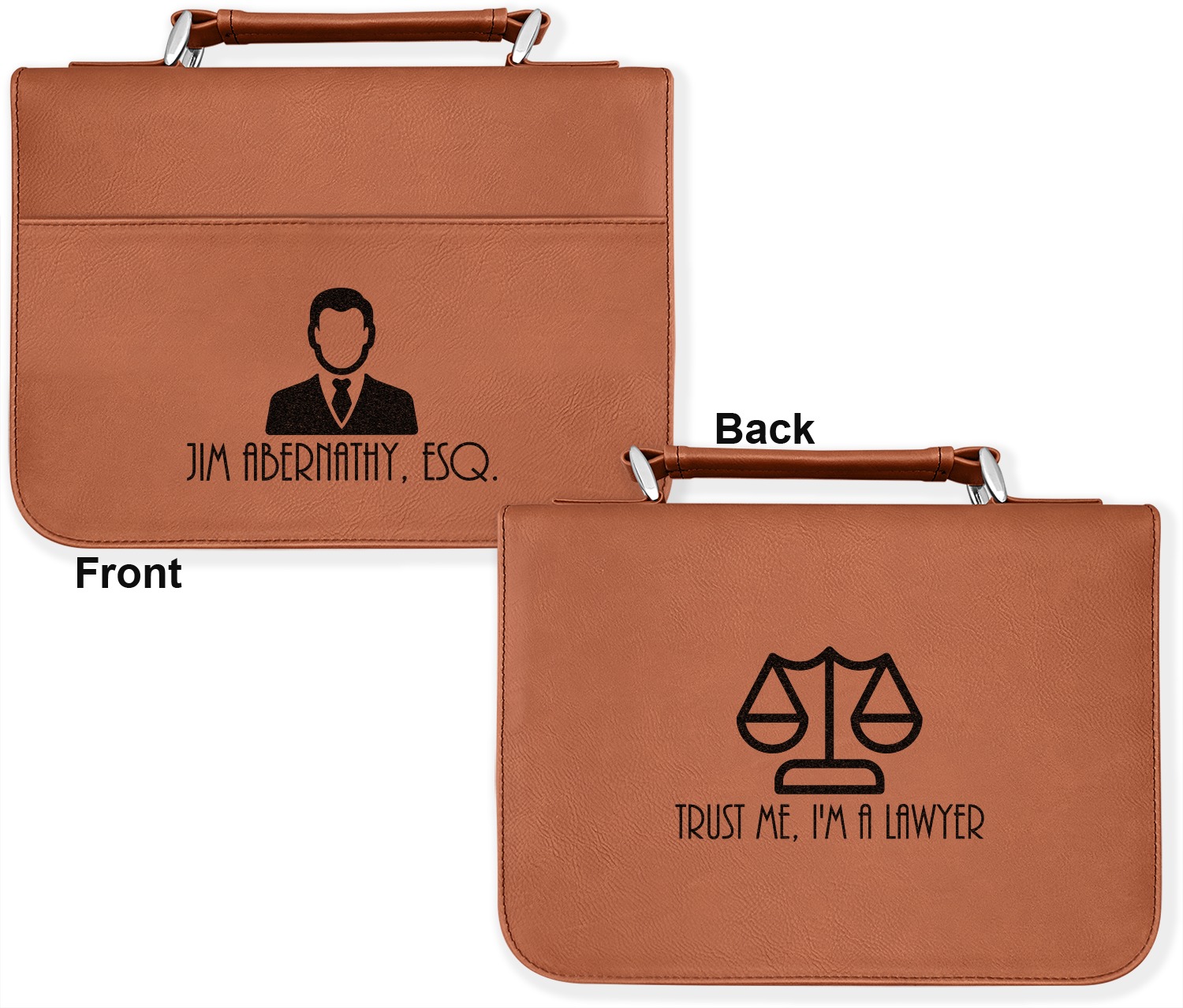 These book covers are fabricated from a fine leatherette in a warm, cognac shade of brown. A wide pocket spans across the front of the book jacket [2,400] and can store any loose papers or notes that you wish to keep. The interior of this personalized Bible cover includes slots on both sides to house the covers of your Bible, and keep it in place. The inside of the spine has a small elastic band to secure a pen. A zipper lines three sides of the cover, while the fourth side features a reinforced handle that allows for easy transport of your enclosed book.