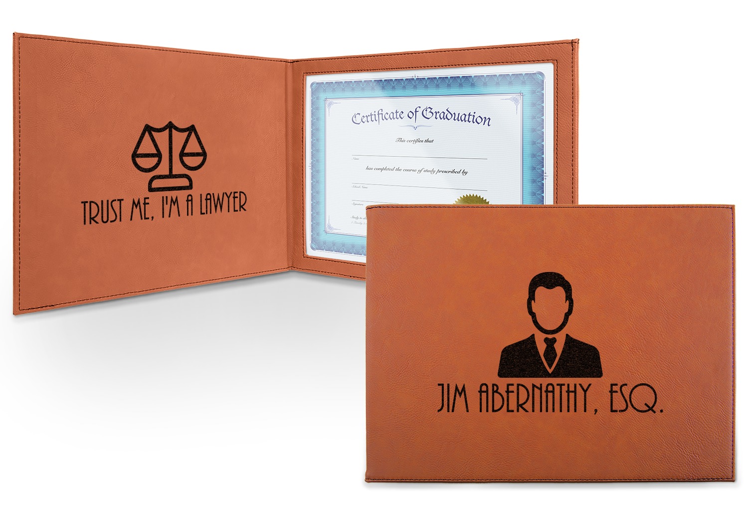 This cognac-colored, leatherette certificate jacket is the ideal way to display or store your hard-earned certificate. When closed, the custom certificate holder measures at 12 by 9 inches. The interior of the certificate cover includes a clear, vinyl window to encase your diploma. The window measures at around 10.5 by 7.5 inches and can accommodate a diploma that measures at up to 8.5 by 11 inches. You can either choose to have your customization laser engraved on the front and interior, or solely the front.