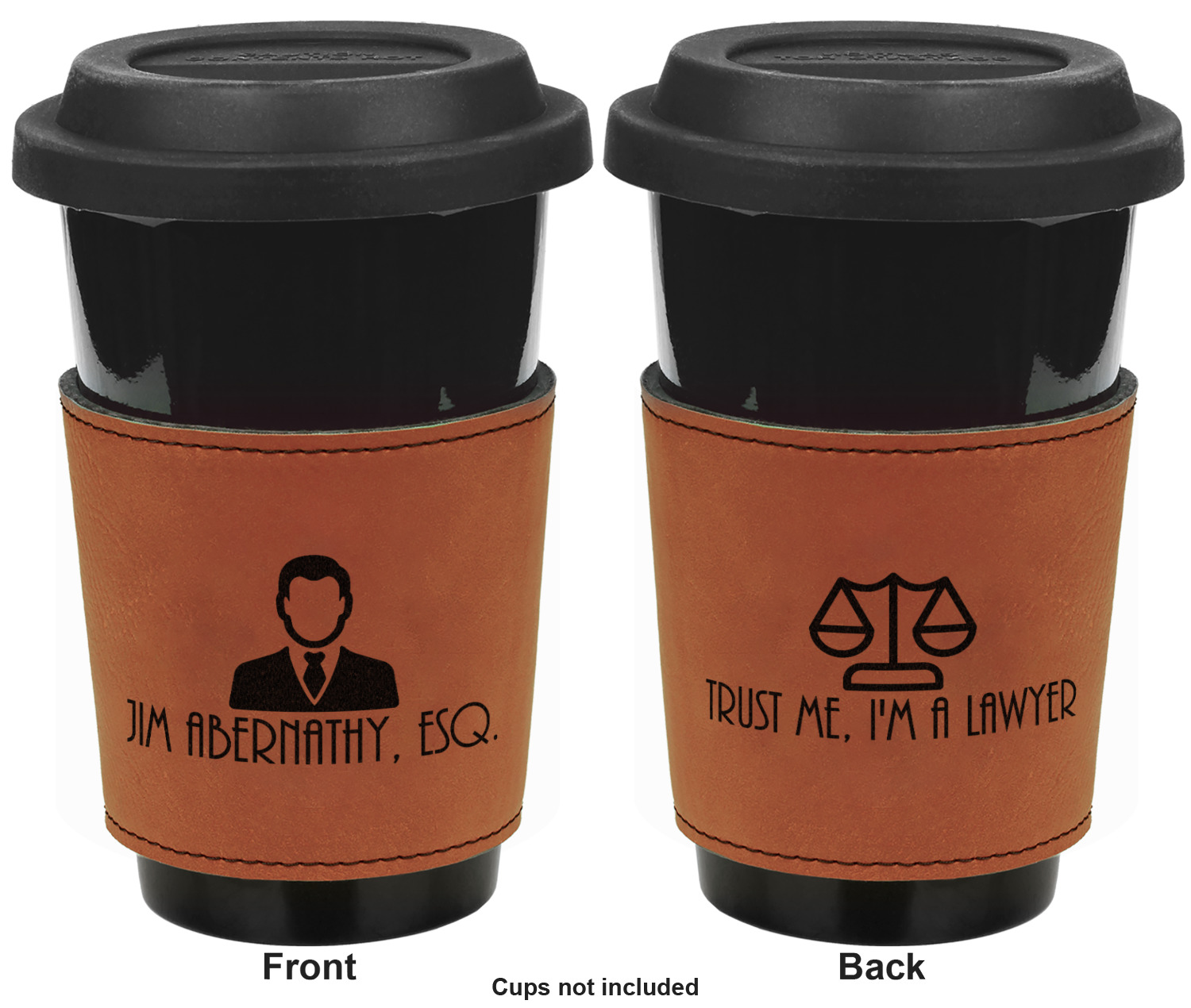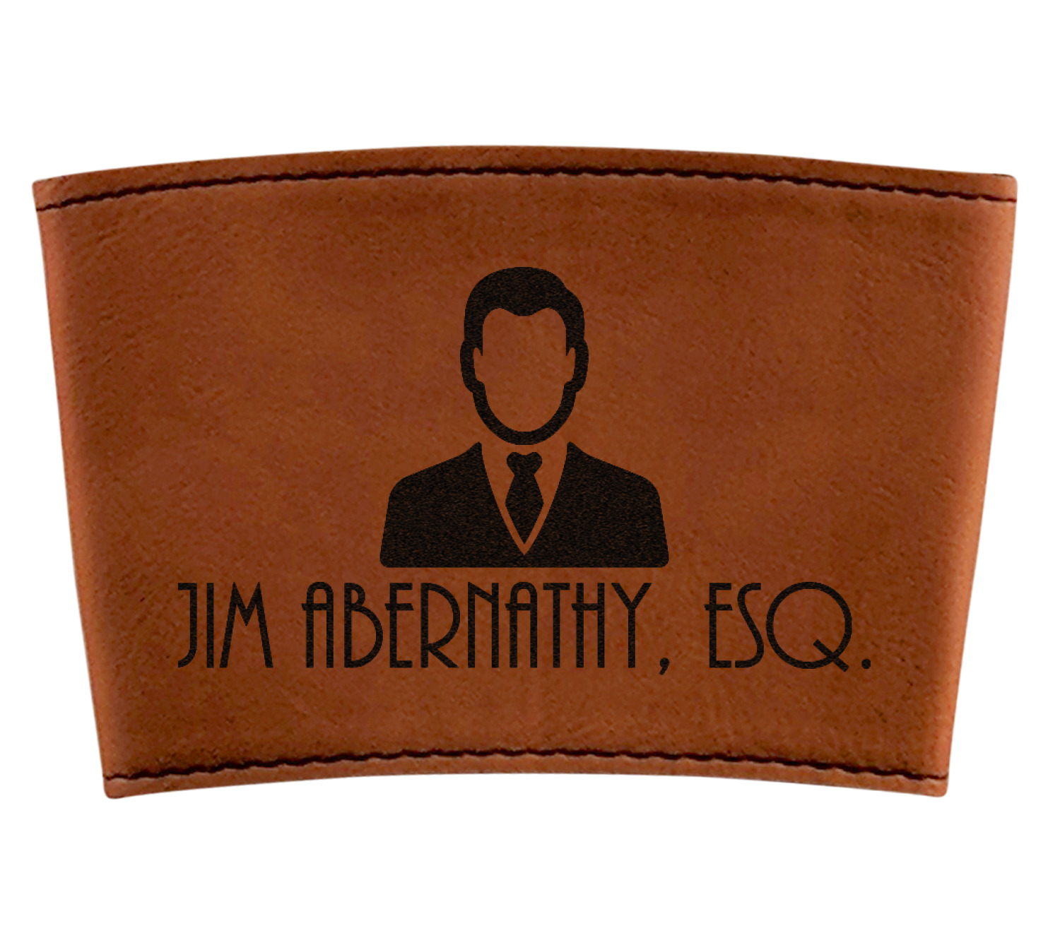 This cup sleeve is made from a suave, cognac-brown leatherette and finished with an intricate, black stitch. The interior of this can sleeve is fabricated from a thin foam material to help insulate your mug's contents. The sleeve is specifically made to suit tapered glasses or mugs, so the top's diameter is 3.5 inches, while the bottom's diameter is 2.75 inches. Your customized design will be laser engraved into the leatherette, leaving behind crisp, black imprint. With these products, we provide you with the option of engraving the front and back, or the front only.