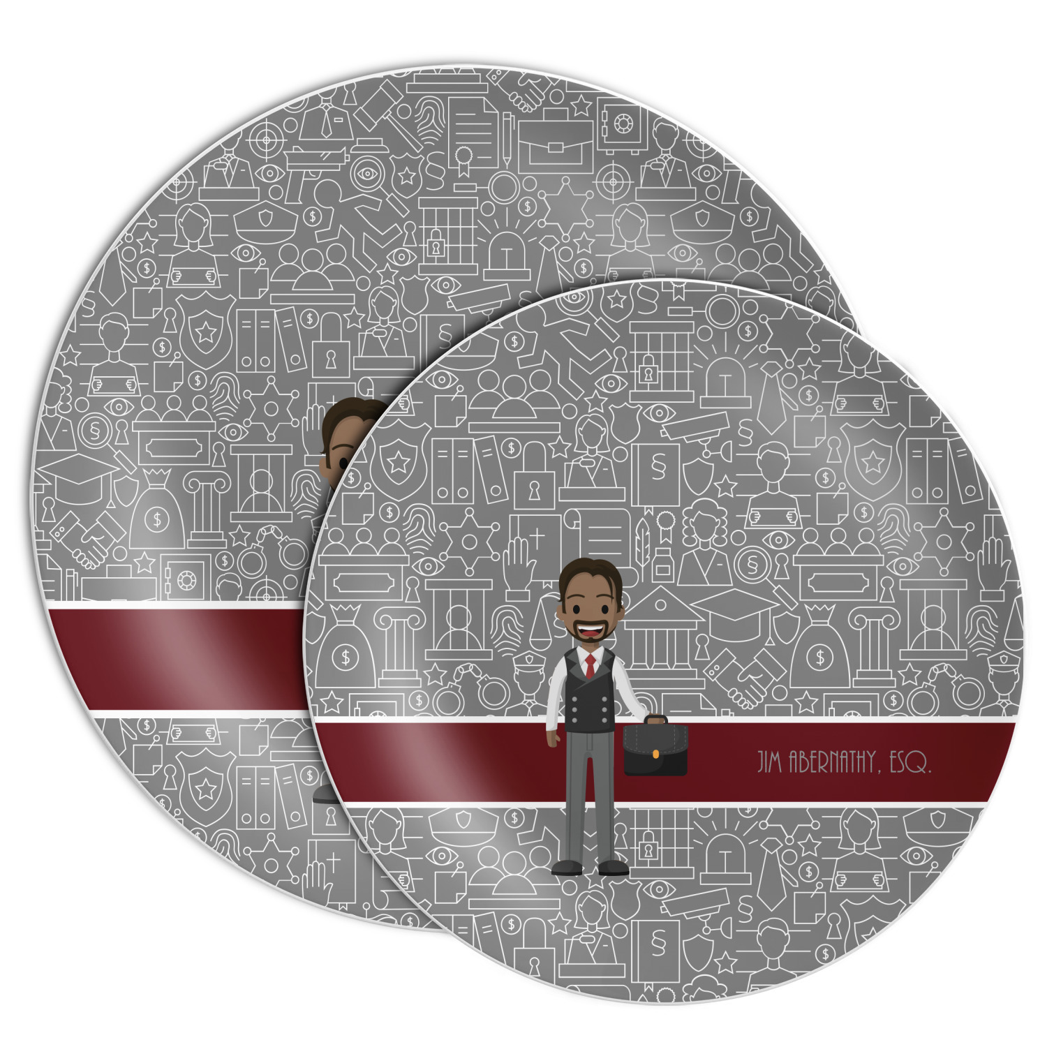 The background has fun attorney / law icons and is grey and white. The main feature of this design is a well dressed avatar of your choosing! You can upload your own or customize ours; you are able to customize the skin tone and hair color to fit what you like! There are also several different avatars / characters in the system to choose from with different hair and body types. Easily put your name or text right next to your avatar to finish off your awesome design.