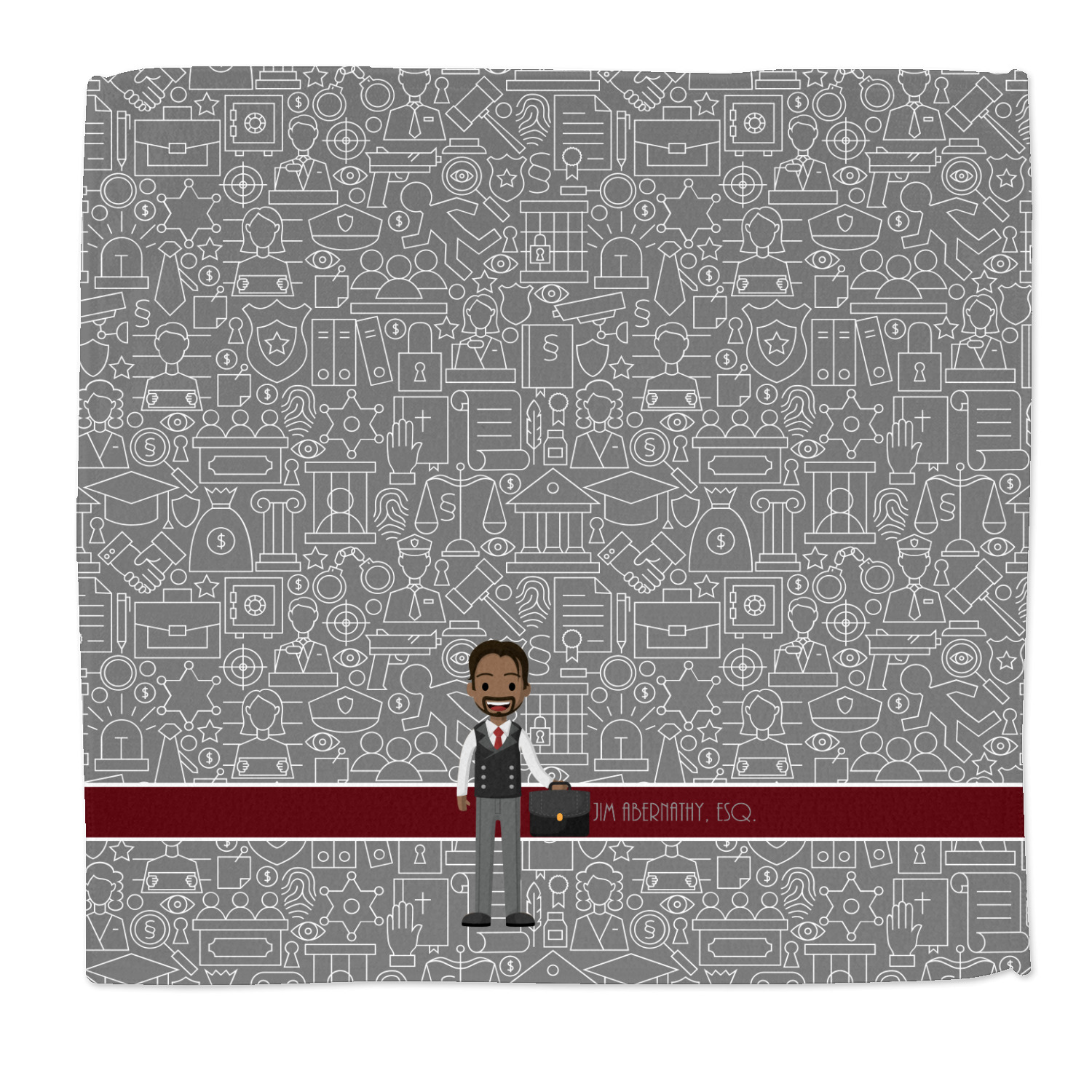 The background has fun attorney / law icons and is grey and white. The main feature of this design is a well dressed avatar of your choosing! You can upload your own or customize ours; you are able to customize the skin tone and hair color to fit what you like! There are also several different avatars / characters in the system to choose from with different hair and body types. Easily put your name or text right next to your avatar to finish off your awesome design.