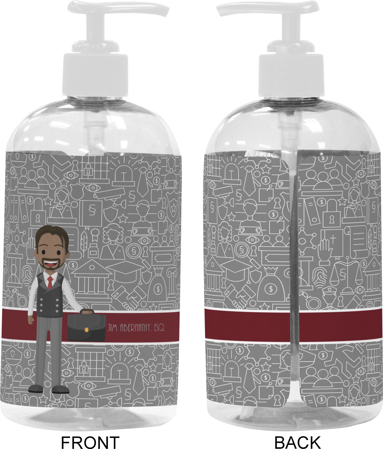 The background has fun attorney / law icons and is grey and white. The main feature of this design is a well dressed avatar of your choosing! You can upload your own or customize ours; you are able to customize the skin tone and hair color to fit what you like! There are also several different avatars / characters in the system to choose from with different hair and body types. Easily put your name or text right next to your avatar to finish off your awesome design.
