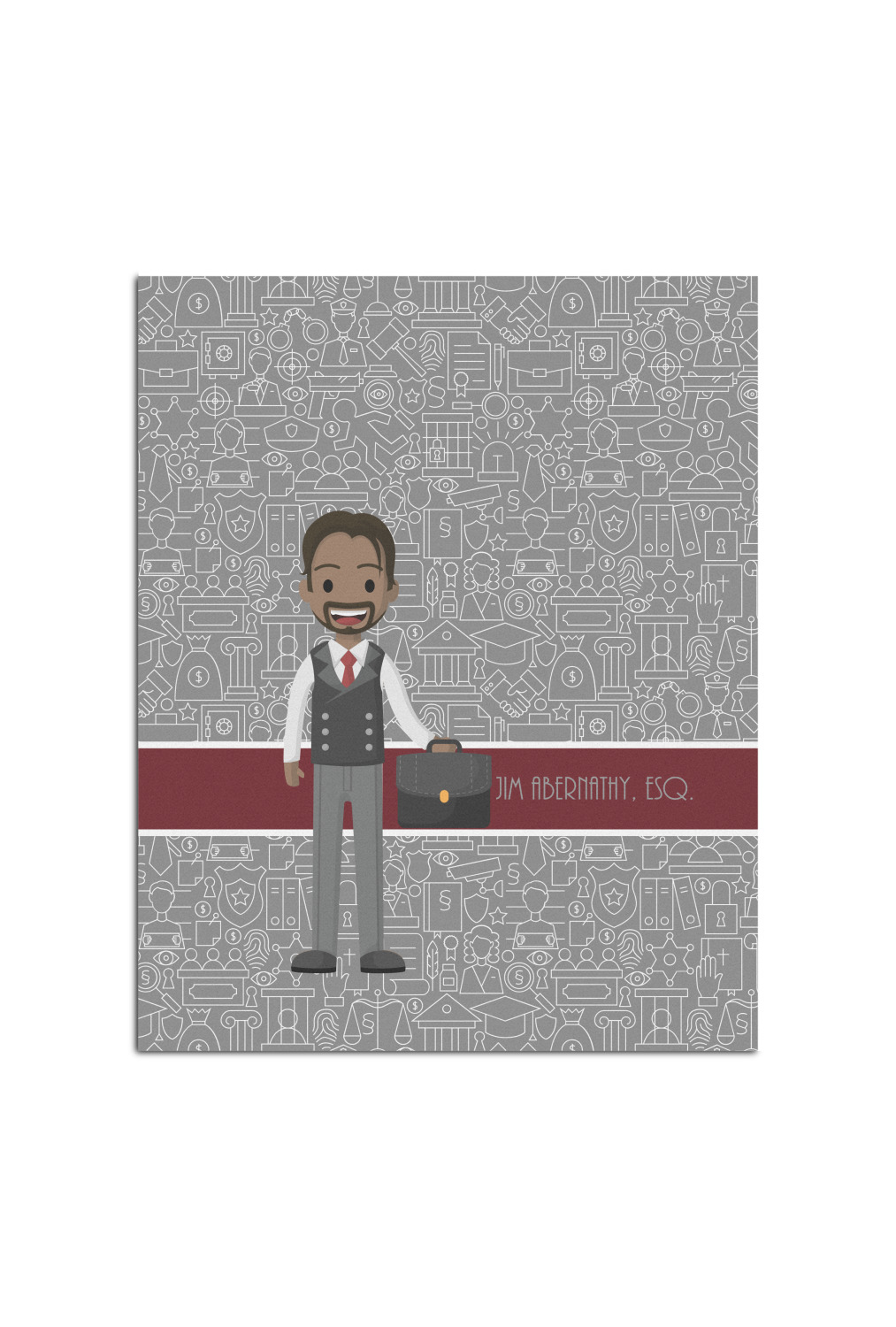The background has fun attorney / law icons and is grey and white. The main feature of this design is a well dressed avatar of your choosing! You can upload your own or customize ours; you are able to customize the skin tone and hair color to fit what you like! There are also several different avatars / characters in the system to choose from with different hair and body types. Easily put your name or text right next to your avatar to finish off your awesome design.