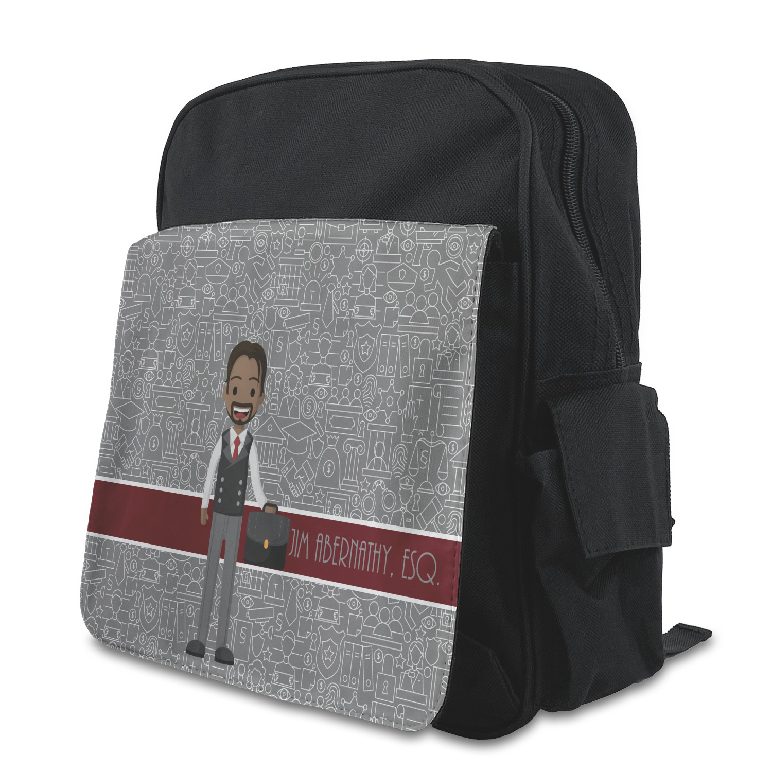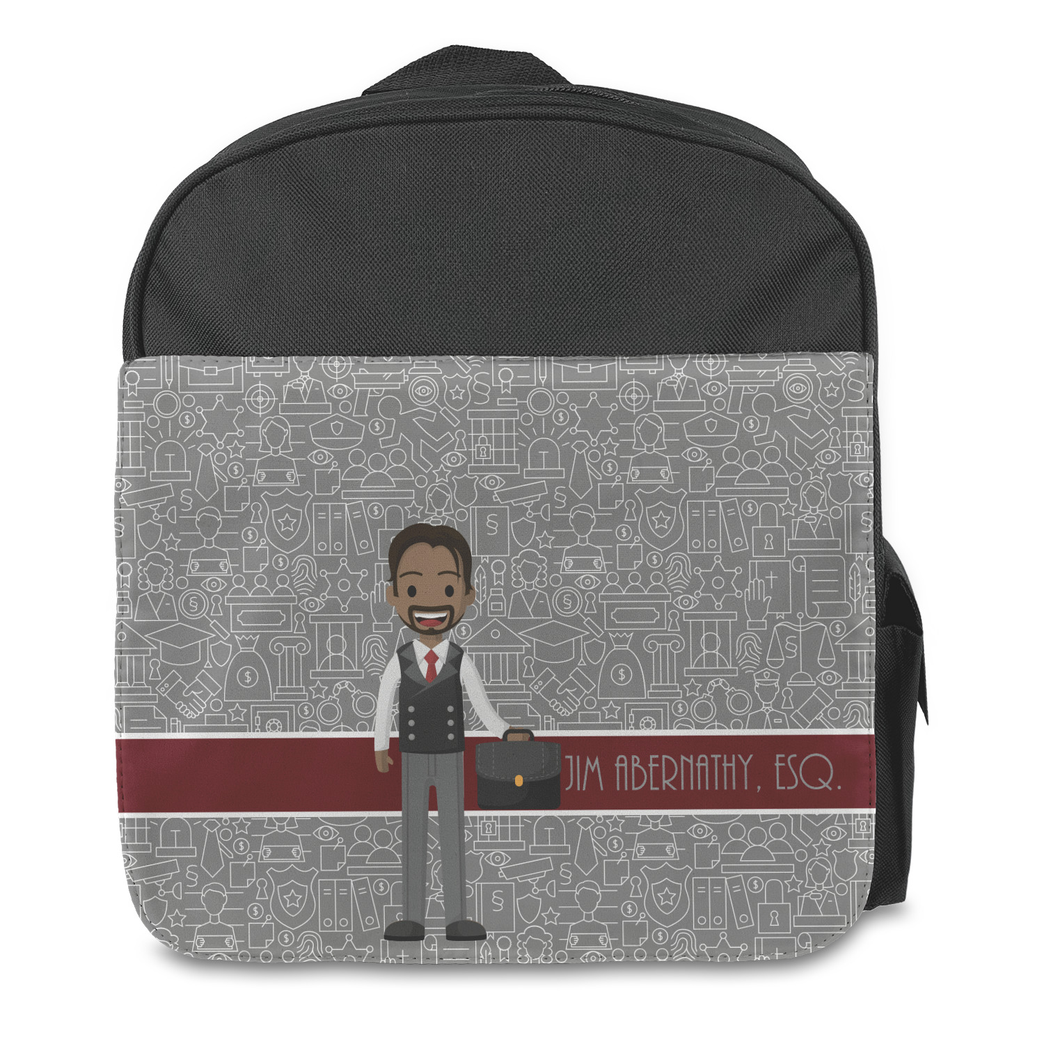 The background has fun attorney / law icons and is grey and white. The main feature of this design is a well dressed avatar of your choosing! You can upload your own or customize ours; you are able to customize the skin tone and hair color to fit what you like! There are also several different avatars / characters in the system to choose from with different hair and body types. Easily put your name or text right next to your avatar to finish off your awesome design.