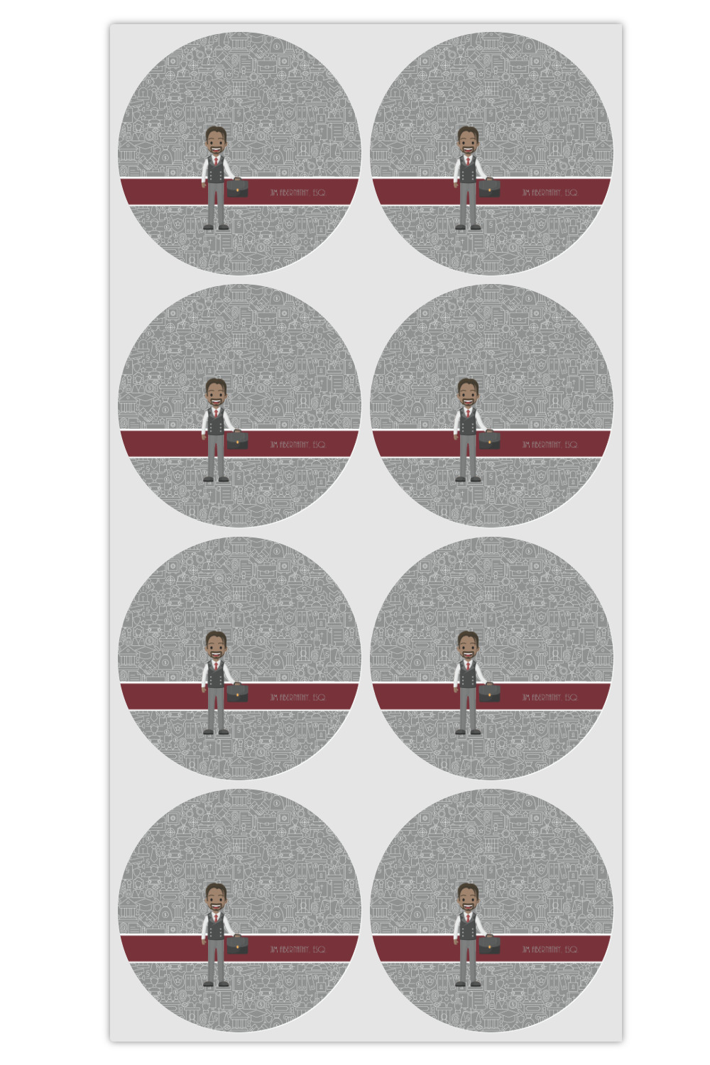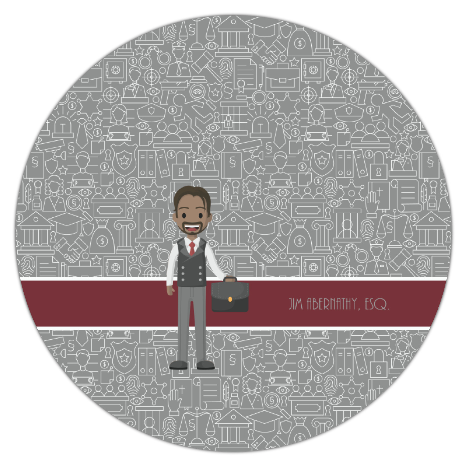 The background has fun attorney / law icons and is grey and white. The main feature of this design is a well dressed avatar of your choosing! You can upload your own or customize ours; you are able to customize the skin tone and hair color to fit what you like! There are also several different avatars / characters in the system to choose from with different hair and body types. Easily put your name or text right next to your avatar to finish off your awesome design.