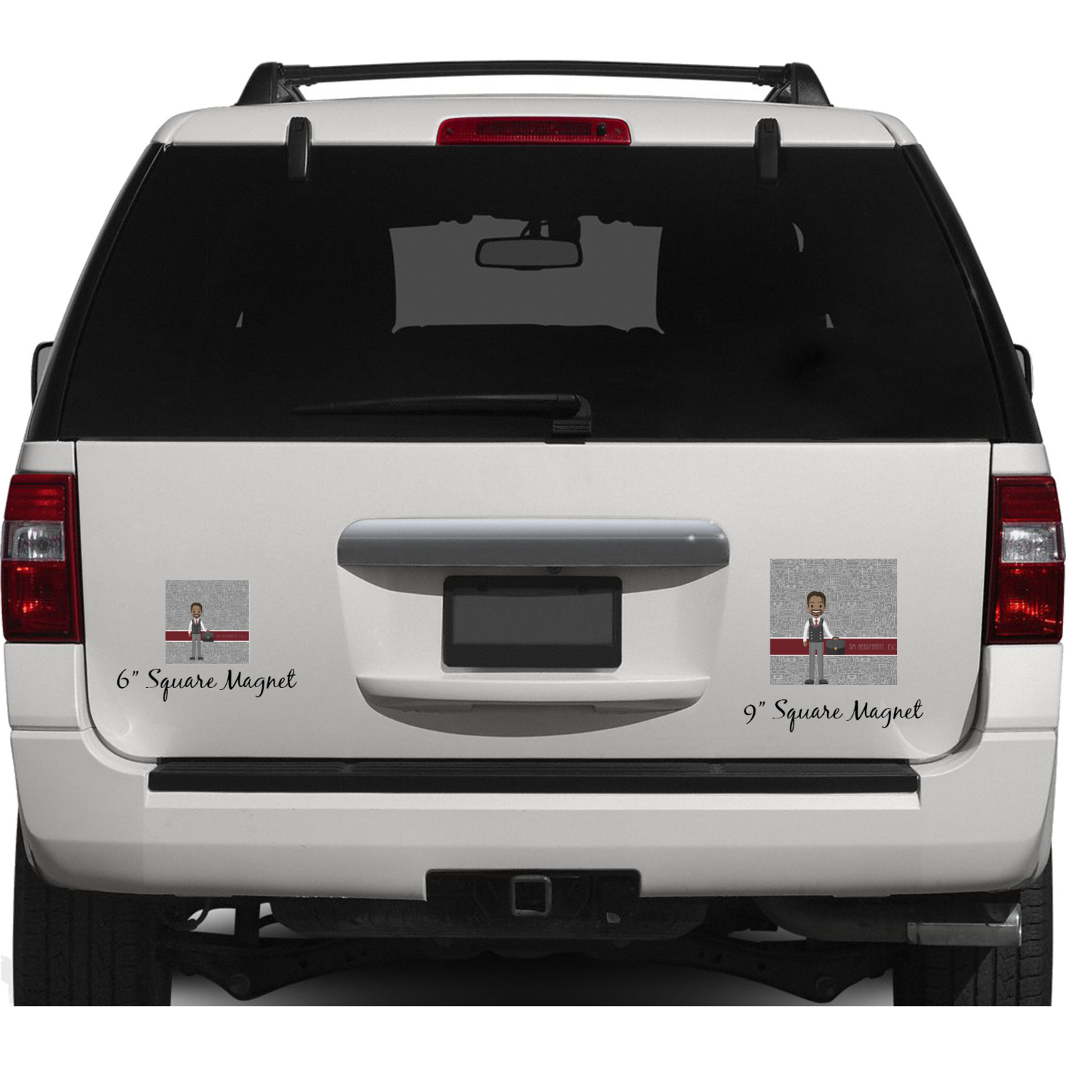 Your personalized car magnets are available for purchase in two shapes and two sizes. We carry round and square editions; each shape can either be 6 by 6 inches, or 10 by 10 inches, depending on your needs. Both versions are 1 millimeter thick, which is considered, within the industry, as the ideal thickness for automobile magnets. The magnetic car decals will adhere to any smooth, metal surface of your cars body, such as the trunk door or a side panel. However, please note that some vehicles are constructed from fiberglass bodies, which prevents the adhesion of anything magnetic. We advise that you test your vehicle before purchasing these magnets.