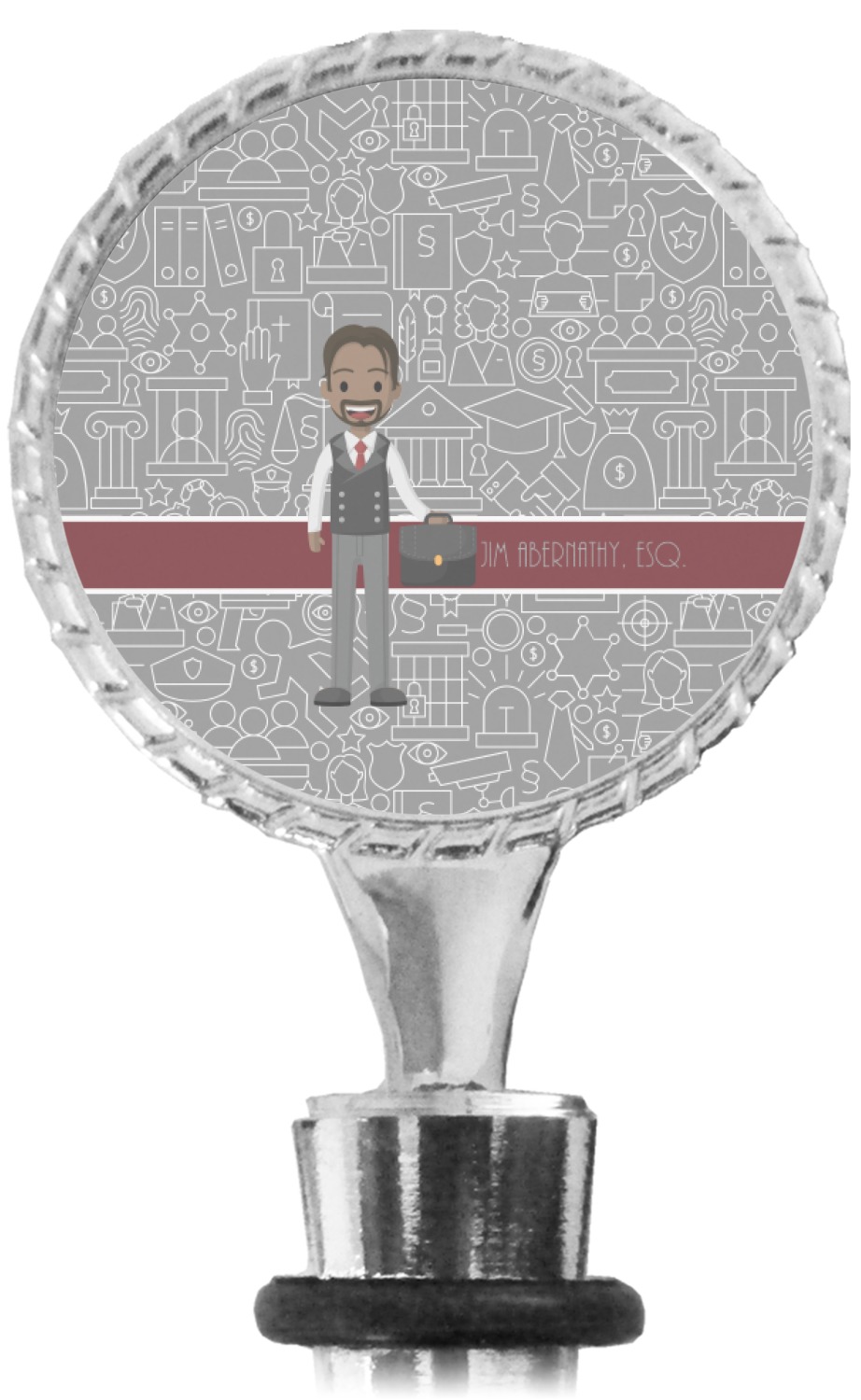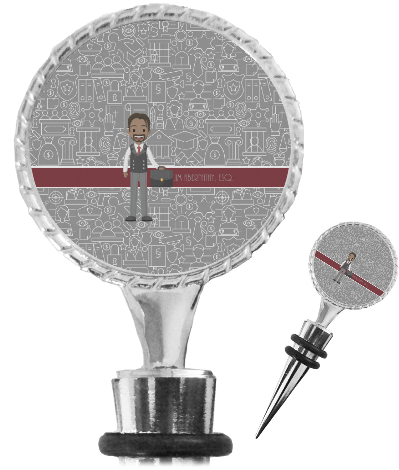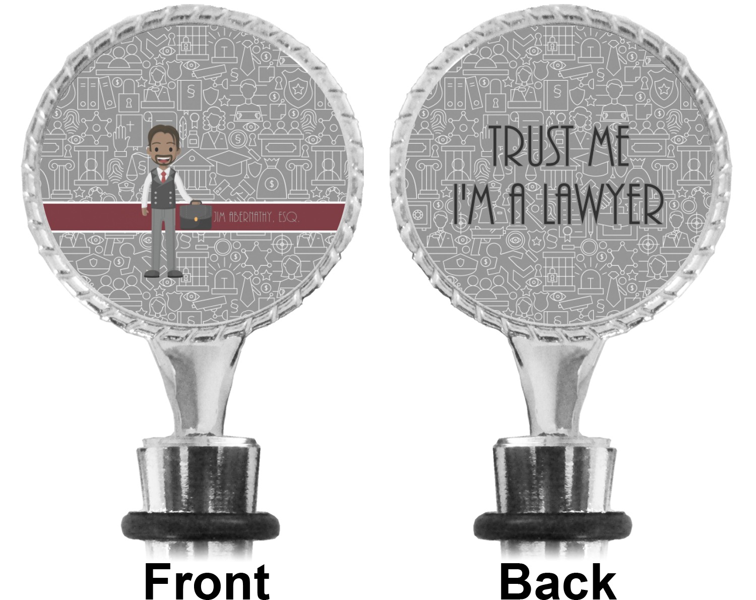 The top part of your bottle stopper is comprised of a zinc ring that displays your customization(s) in its middle, on both sides. The ring is heavy duty, with a bright chrome finish. The body of the wine stoppers have two silicone rings to provide an airtight seal. These wine bottle stoppers measure at 1.625" L x 0.8125" W x 4.625" H; your custom wine stopper is meant to fit into most standard-sized wine bottles.