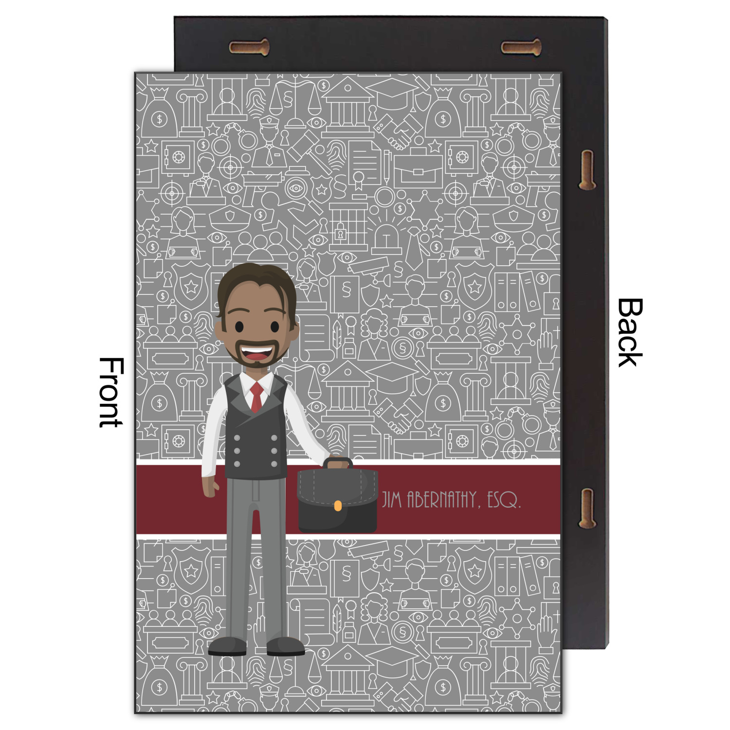 The background has fun attorney / law icons and is grey and white. The main feature of this design is a well dressed avatar of your choosing! You can upload your own or customize ours; you are able to customize the skin tone and hair color to fit what you like! There are also several different avatars / characters in the system to choose from with different hair and body types. Easily put your name or text right next to your avatar to finish off your awesome design.