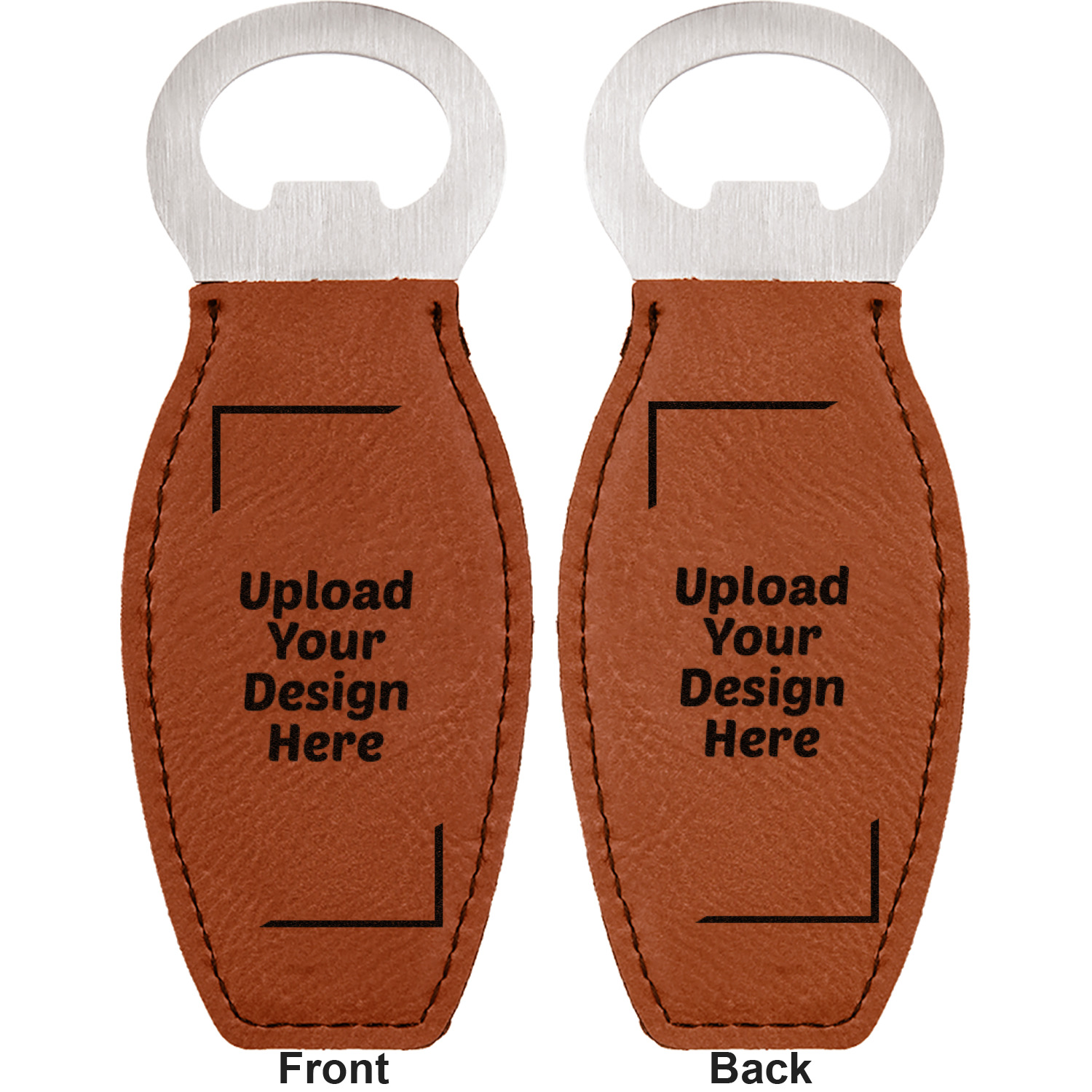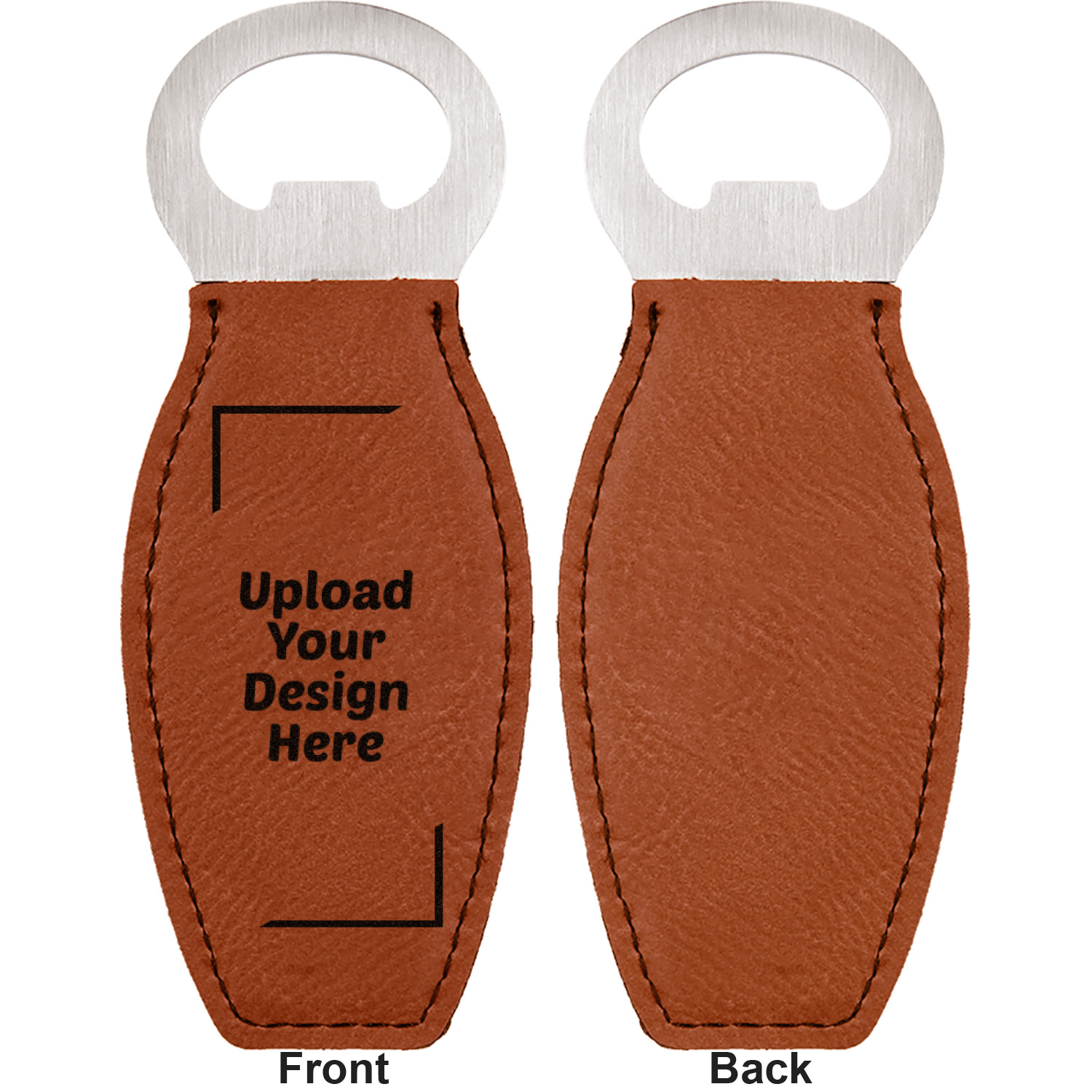 Built from stainless steel, these custom bottle openers are wrapped in a cognac-colored leatherette. Sharp, black stitching lines the edges for extra durability and a finished touch. Your personalization is laser-engraved onto the surface of this leatherette, leaving behind a crisp, black coloration. At 4.6 by 1.8 inches, this beer bottle opener gives you much of leverage when trying to open a stubborn bottle. On the opposite end of the opener, you'll find a magnet that you can use to display your new, unique bottle opener!