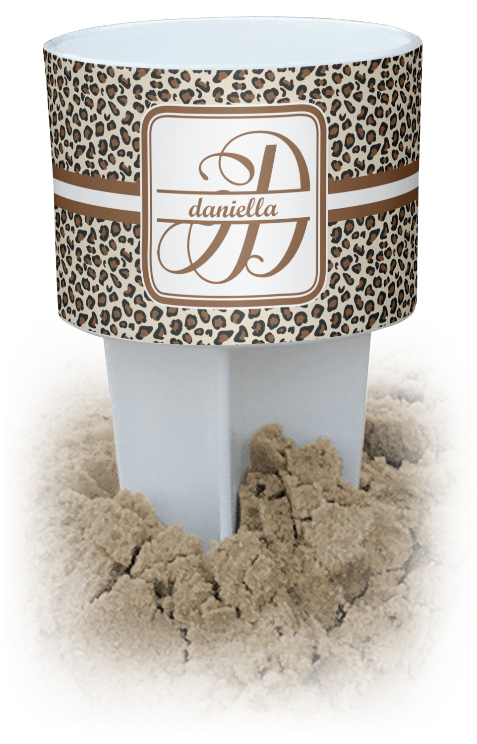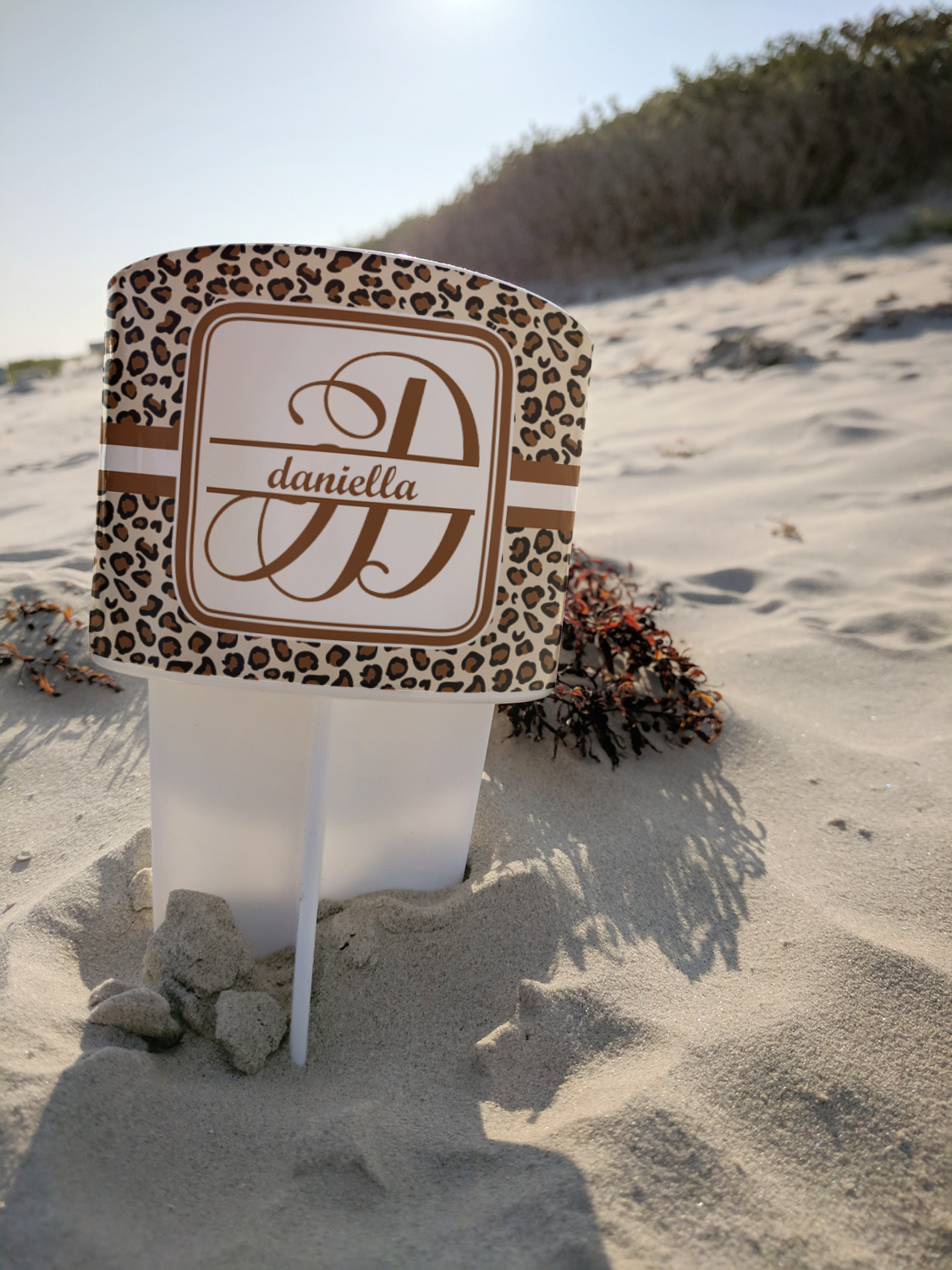 This cup holder has a large stake at its bottom that anchors it to the sand or ground below, while the cup holder rests above the stake. The entire drink holder is made of durable plastic and displays your customization around the cup holder portion. We sell these personalized beach spikers in two different colors: black and white.