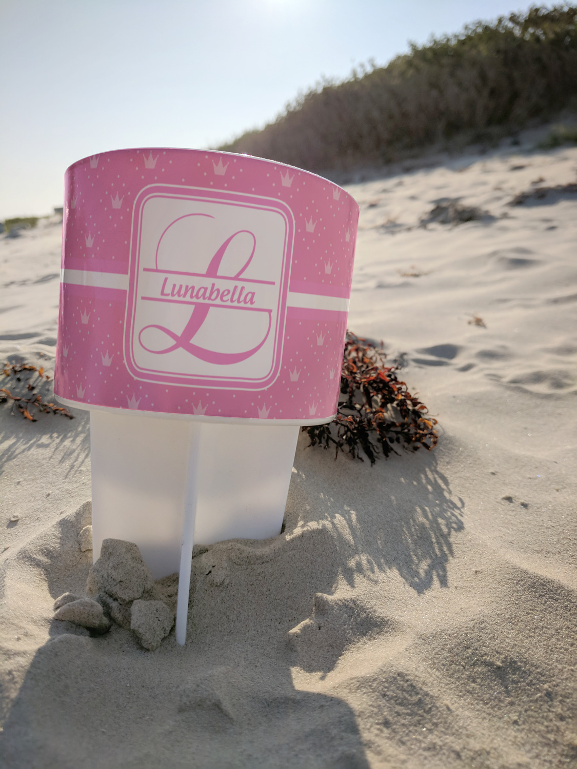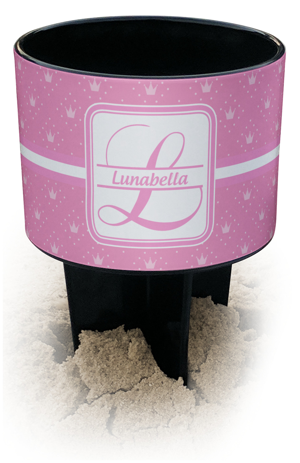 This cup holder has a large stake at its bottom that anchors it to the sand or ground below, while the cup holder rests above the stake. The entire drink holder is made of durable plastic and displays your customization around the cup holder portion. We sell these personalized beach spikers in two different colors: black and white.