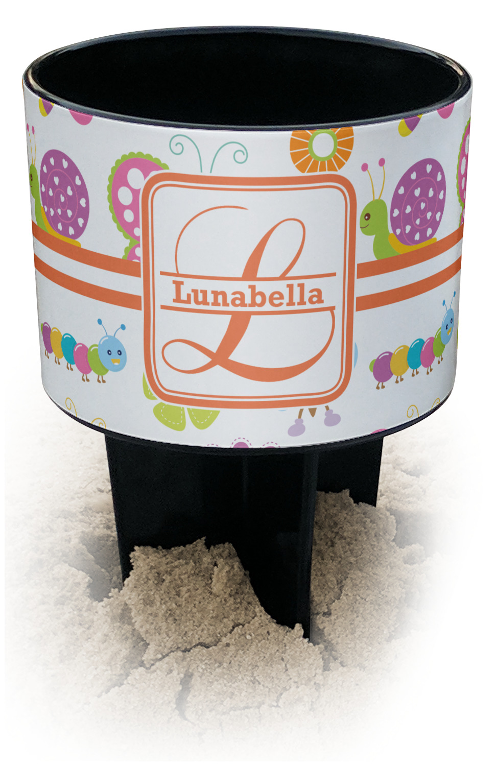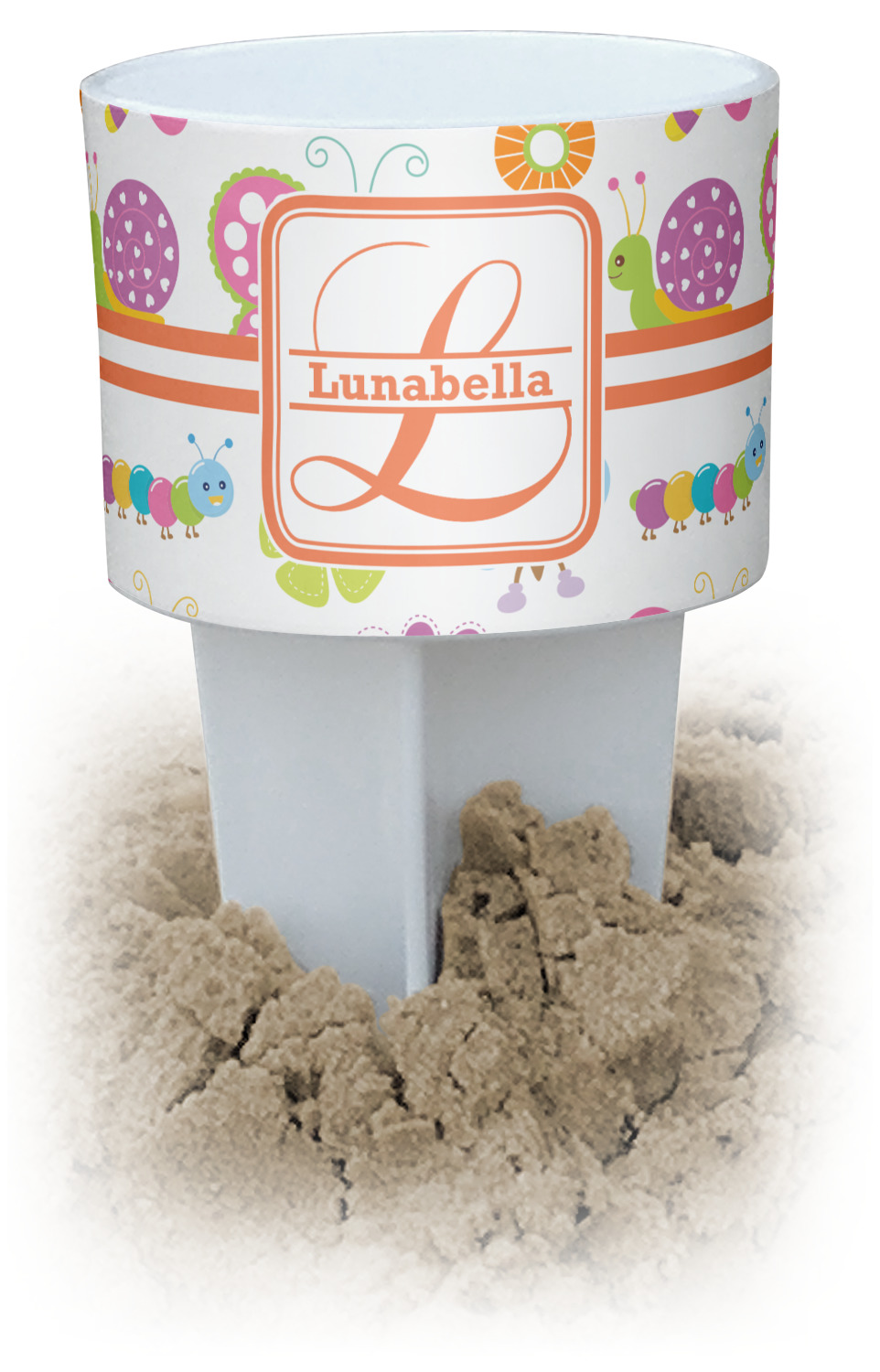 This cup holder has a large stake at its bottom that anchors it to the sand or ground below, while the cup holder rests above the stake. The entire drink holder is made of durable plastic and displays your customization around the cup holder portion. We sell these personalized beach spikers in two different colors: black and white.