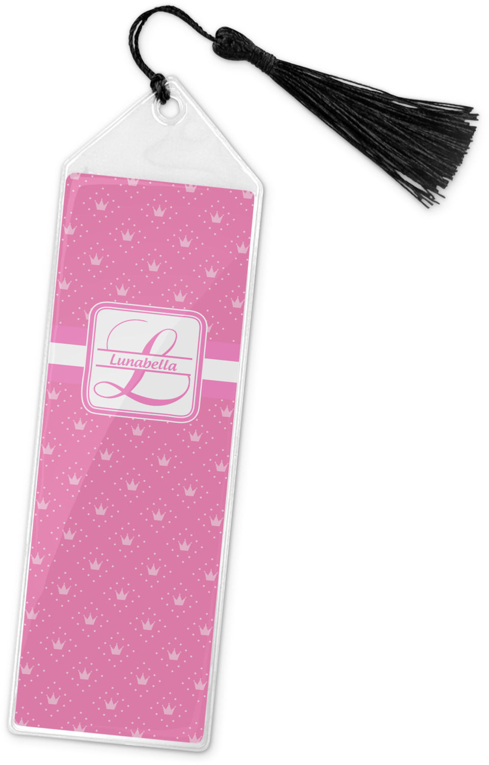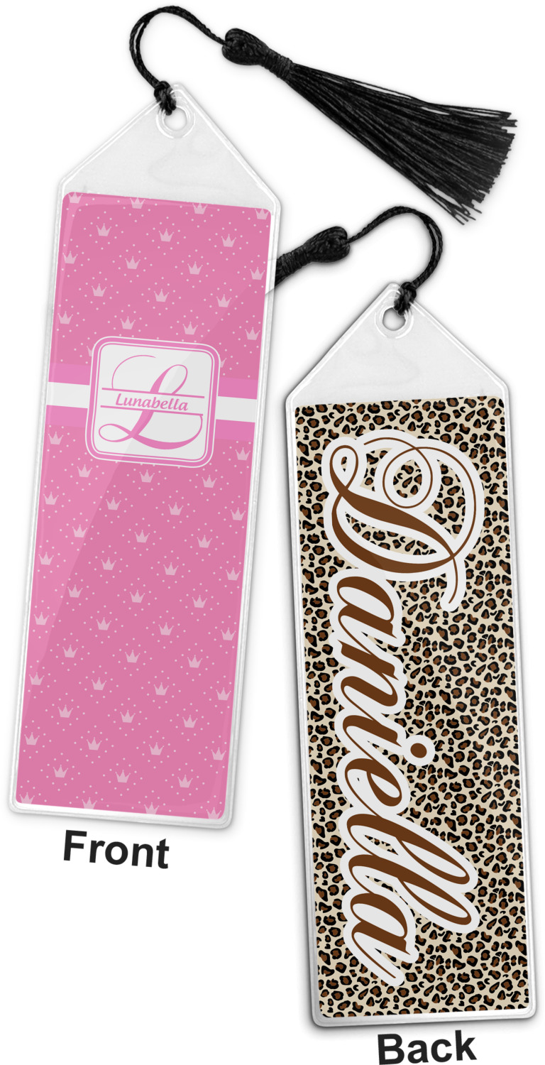 Your personalized bookmark is made of a sturdy, clear vinyl, and is approximately 7.5" x 2.25". We display your personalization on vinyl inserts that are placed on both sides. Accompanying each book marker is a black, fringe tassel that attaches to the reinforced, triangular header.