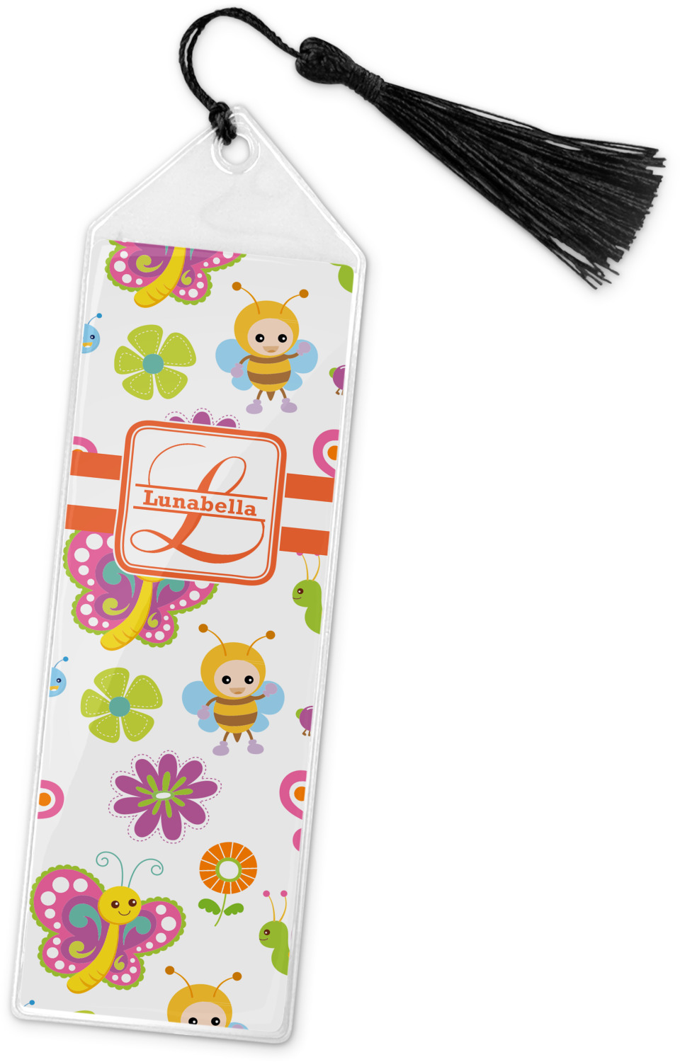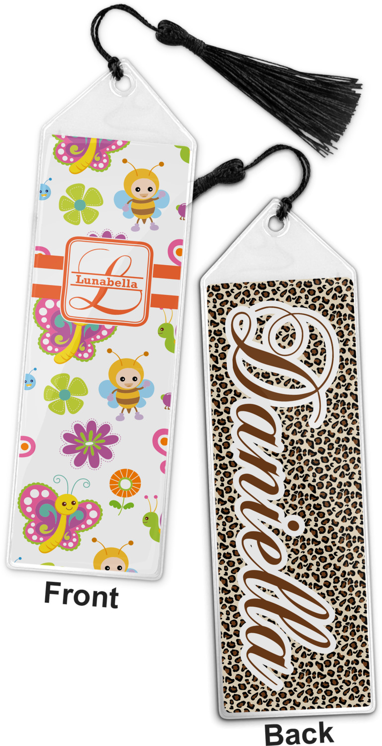 Your personalized bookmark is made of a sturdy, clear vinyl, and is approximately 7.5" x 2.25". We display your personalization on vinyl inserts that are placed on both sides. Accompanying each book marker is a black, fringe tassel that attaches to the reinforced, triangular header.