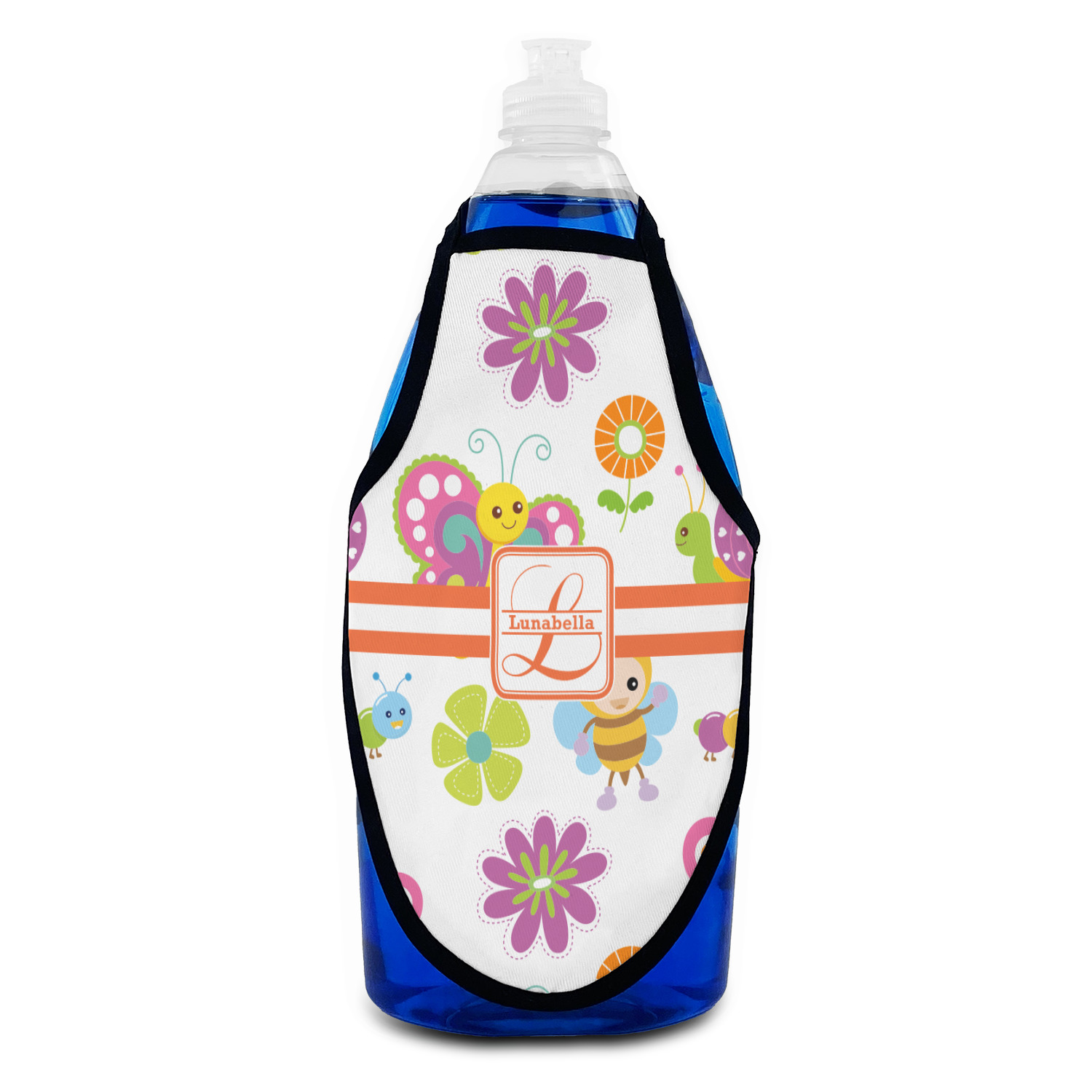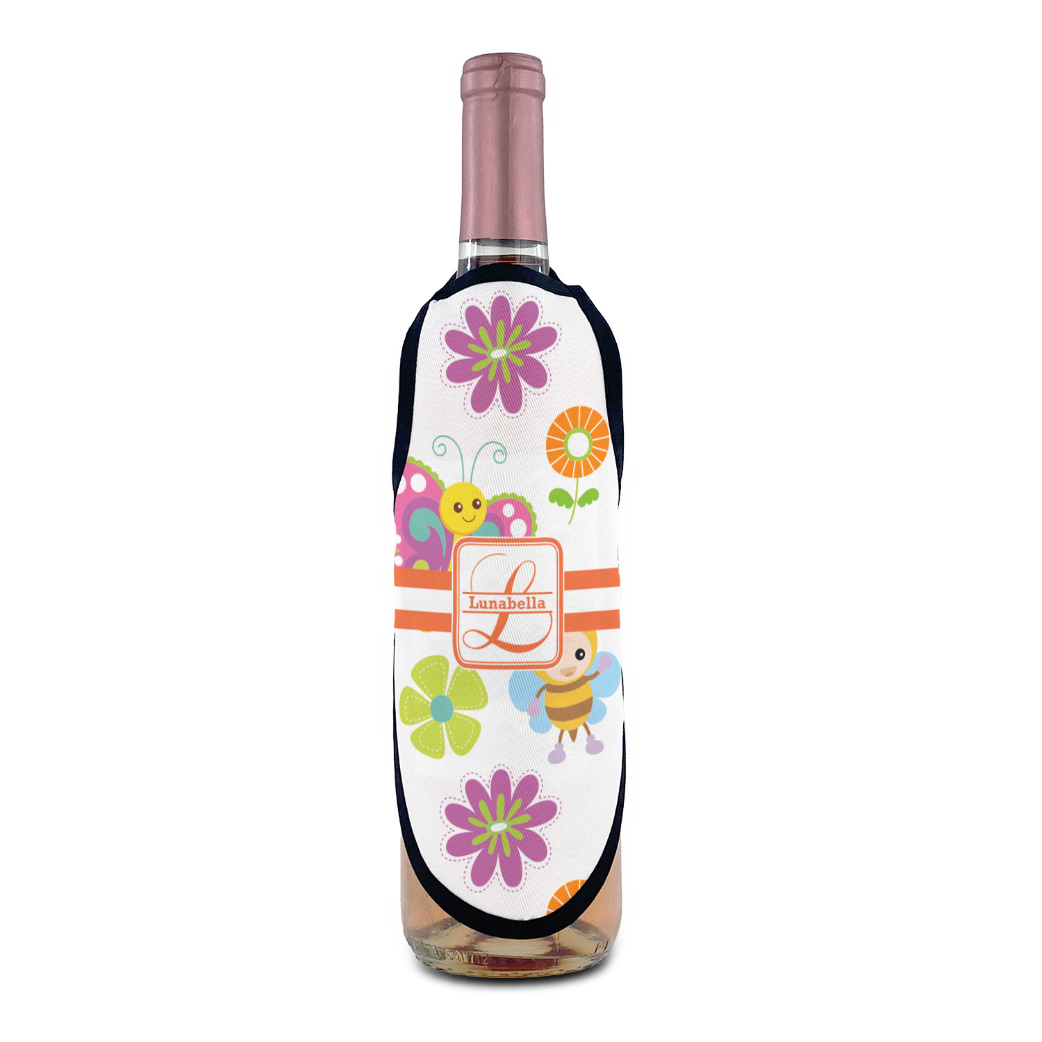Made from a polyester fabric with black trim and tie string, these bottle aprons fit most large sized bottles including wine bottles, liquor bottles and dish soap bottles. With an included sliding cord lock the neck is adjustable to make these be a universal fit for most any sized bottle. The printed space of the apron measures approximately 8.5" tall and at its widest point the printed area is 6" wide.