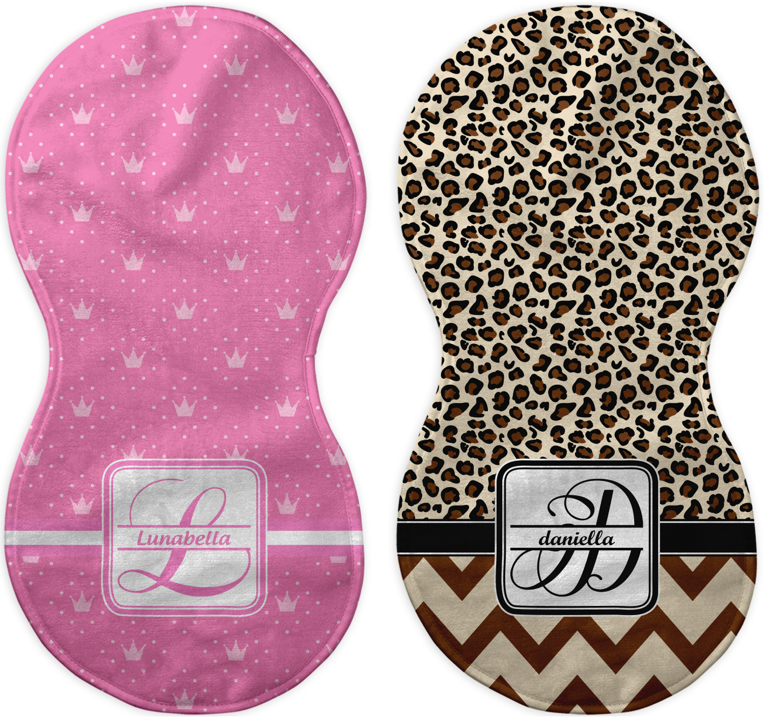 Choose your baby burp cloth from our two styles - Fleece (rectangular) or Microfiber Velour (peanut shape). The lightweight and absorbent design makes each burp cloth multipurpose; use them as a burp pad, a lap pad, a changing table, or a spare cloth to clean up any baby mess. Your customization is displayed across the front with baby-safe ink to ensure extra comfort with a white backing.