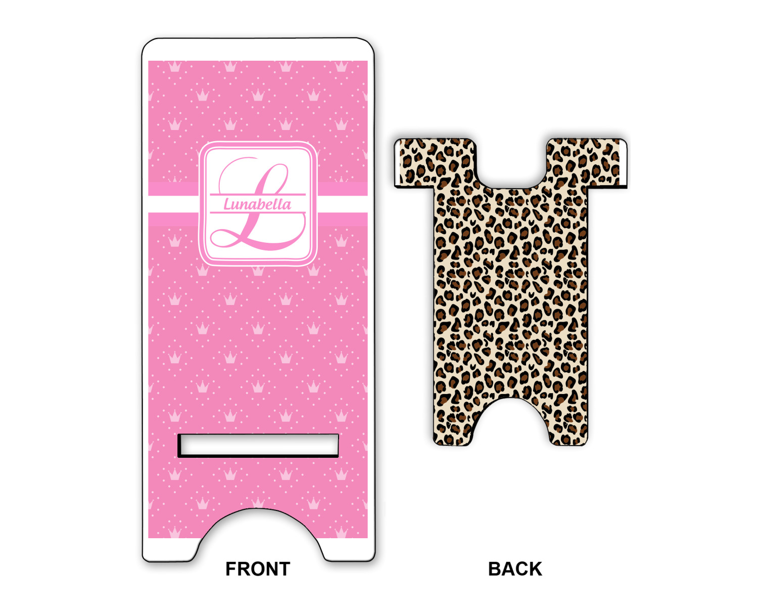 To meet your needs, we offer four variations of this IPhone stand. The backboard of the first version is shaped as a plain, yet sleek rectangle, and is available in two sizes. Our smaller size is approximately 4 by 3.25 by 7 inches, while the larger model is 4 by 3.77 by 8.5 inches. Alongside this model, we also provide you with a more decorative option. The upper part of our second version features a curved edge, for a classy, suave appearance. This phone holder is also sold in two sizes: a smaller version, which is 4 by 3.25 by 7 inches, and our larger model, which is 4 by 3.77 by 8.5 inches. Both models will support large phones, but the larger model is better if you wish to proudly display your personalized design.