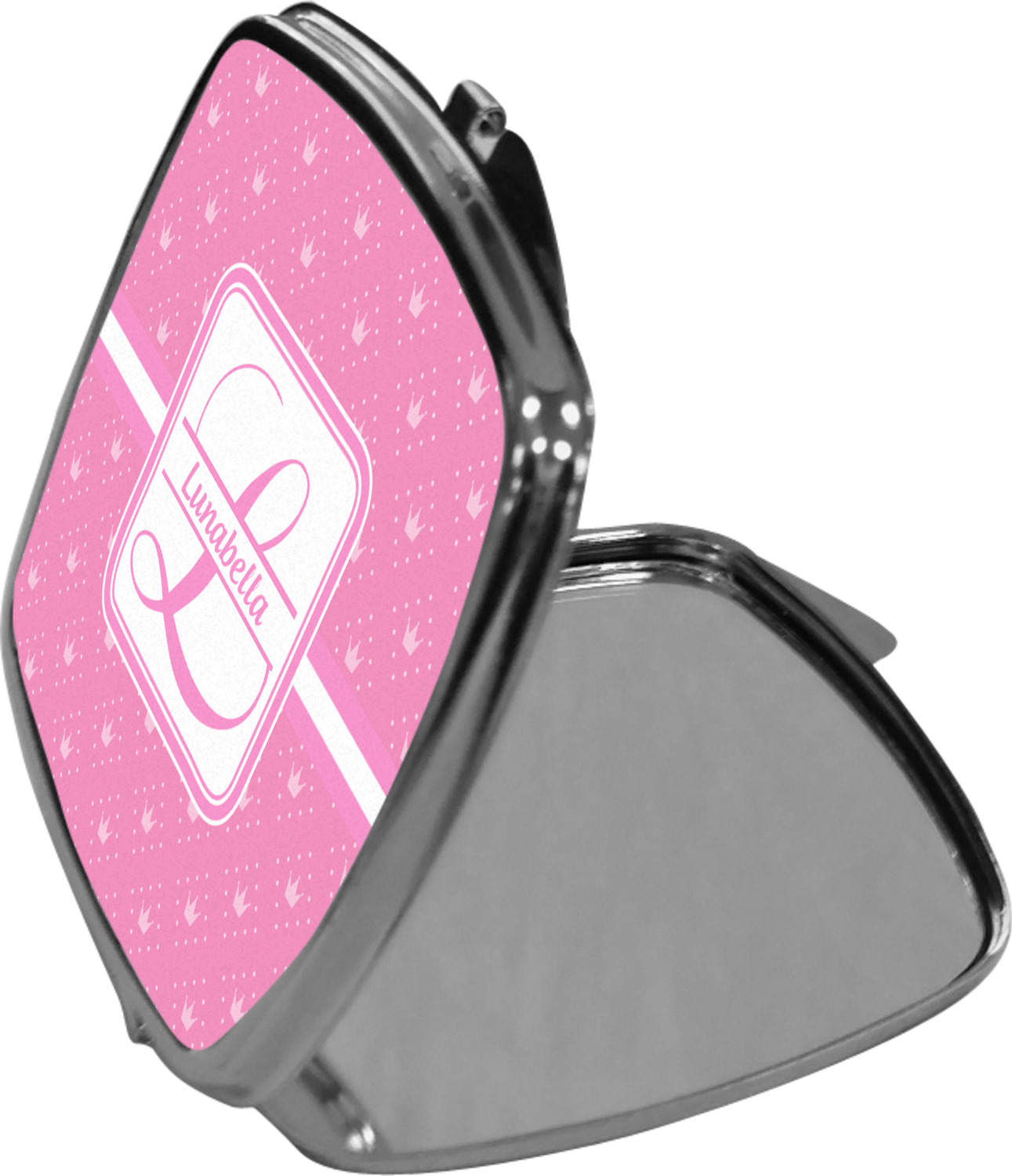 Our compact mirrors are customized with your design on one side. The other side is patterned silver tone metal. Inside, there are two mirrors.