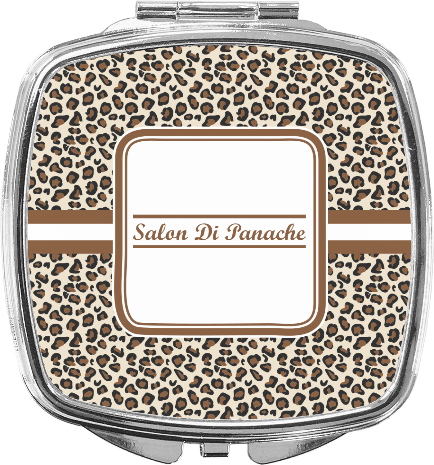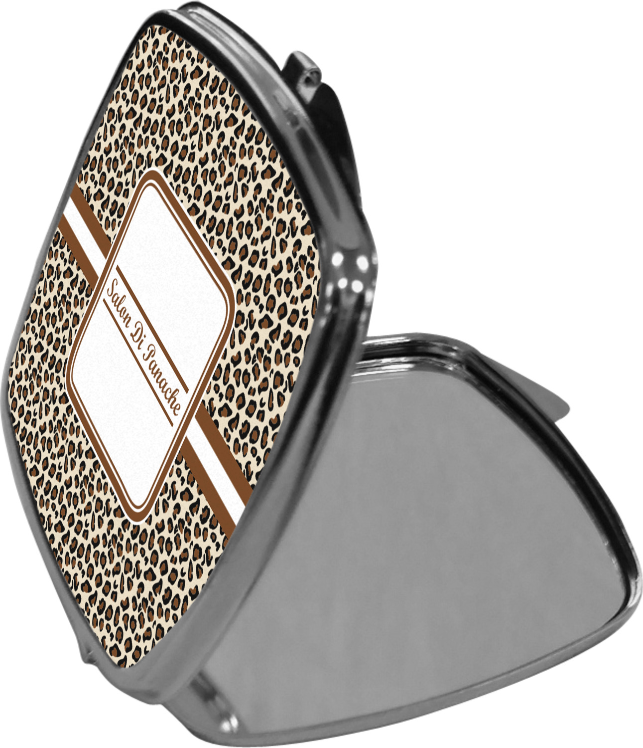 Our compact mirrors are customized with your design on one side. The other side is patterned silver tone metal. Inside, there are two mirrors.