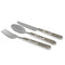 This set features a fork, a spoon and a knife. The fork has 4 prongs, the spoon is a nice size for adults and the knife has a short serrated section for cutting as well as a smooth section for spreading. The pieces in this silverware set are crafted from Stainless Steel with a durable plastic handle.