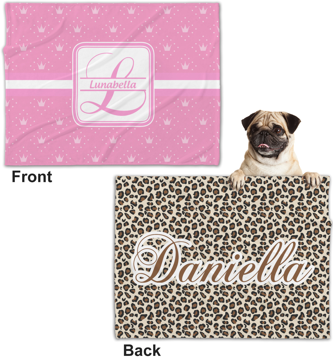 These dog blankets are crafted from a gentle, soft-to-the-touch, minky material. We print your customizations, either matching or differing, on both the top and underside of the blanket. These personalized dog blankets are available in two sizes: regular and large. Our regular size, at 40" x 30", accommodates small and some medium size dogs. At 60" x 50", our large dog blanket is a better fit for bigger breeds. Though specialized for dogs, these blankets still make a thoughtful gift for your favorite feline, or any other pet in mind!