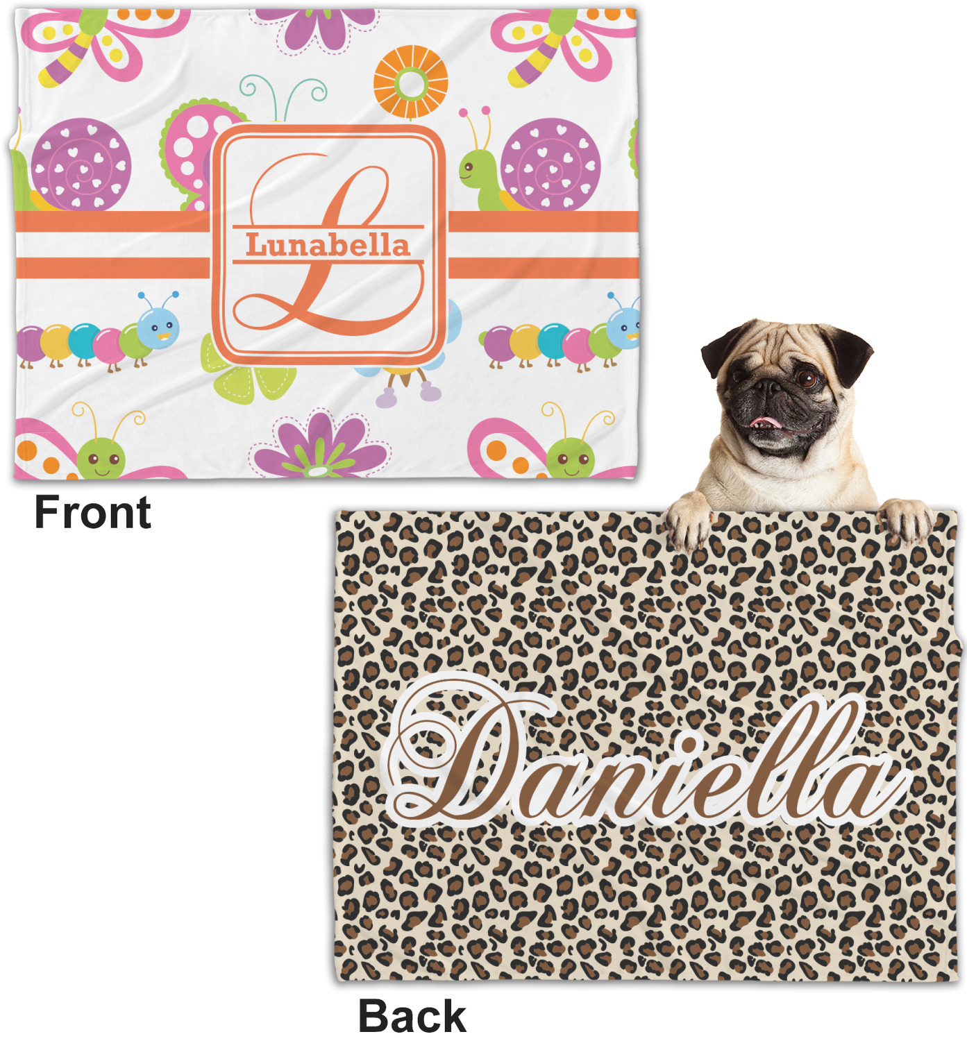These dog blankets are crafted from a gentle, soft-to-the-touch, minky material. We print your customizations, either matching or differing, on both the top and underside of the blanket. These personalized dog blankets are available in two sizes: regular and large. Our regular size, at 40" x 30", accommodates small and some medium size dogs. At 60" x 50", our large dog blanket is a better fit for bigger breeds. Though specialized for dogs, these blankets still make a thoughtful gift for your favorite feline, or any other pet in mind!