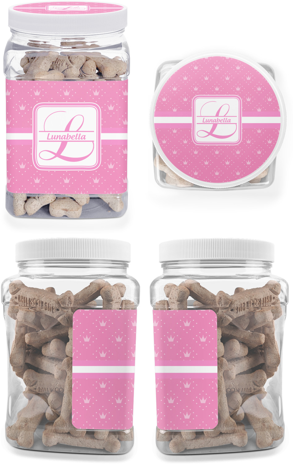 This half gallon jar, made from a sturdy plastic, is the perfect way to keep treats from any naughty pet paws, while still keeping them ready on hand for when your pup performs an impressive trick. This dog cookie jar features a screw-on, white lid that displays your personalized design on a vinyl sticker. We apply another customized sticker that wraps around the front and sides of the jar. Our dog treat jar also has indentations on the rear ends of the sides, which allows for convenient handling, and its square frame allows for easy storage.
