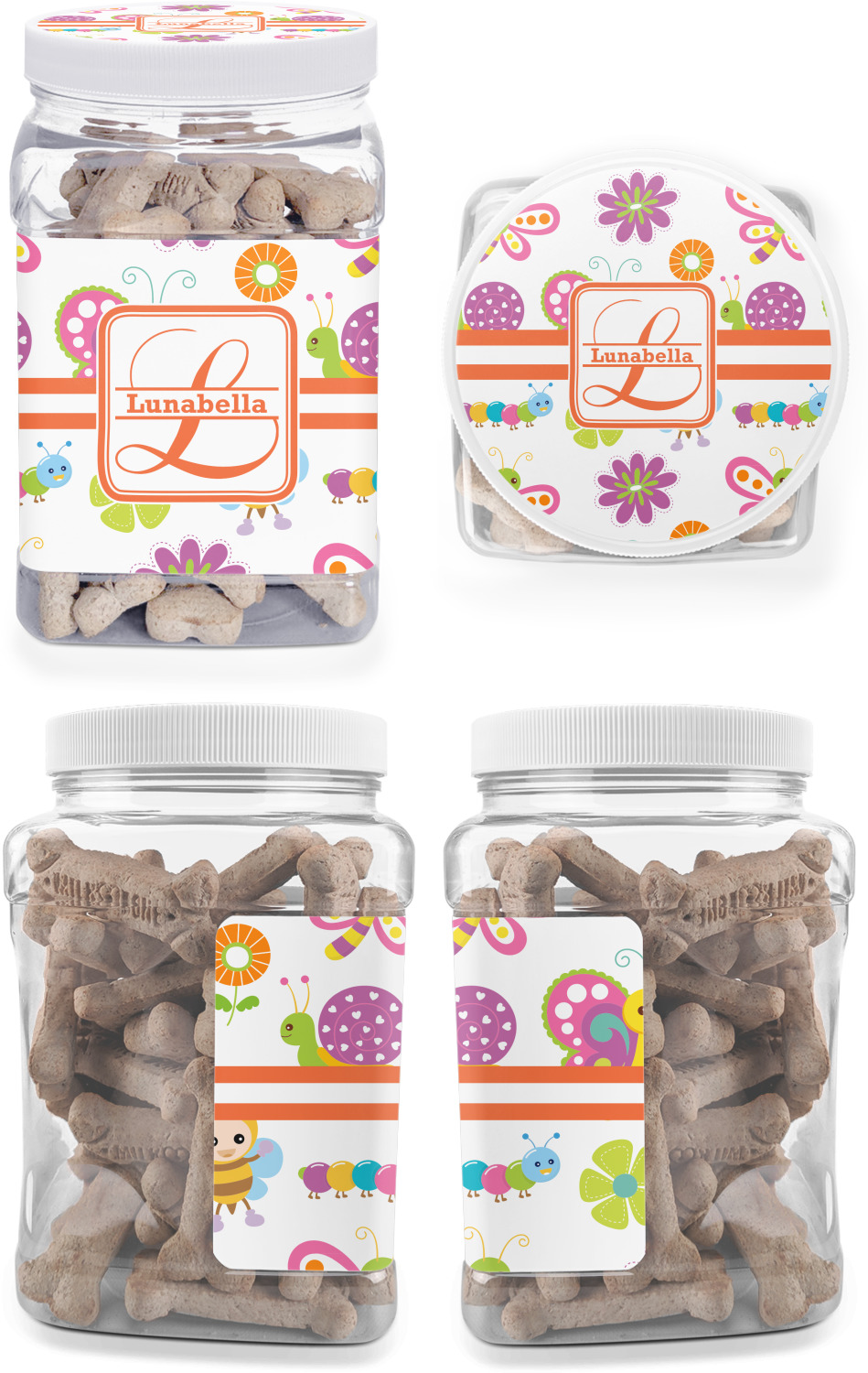 This half gallon jar, made from a sturdy plastic, is the perfect way to keep treats from any naughty pet paws, while still keeping them ready on hand for when your pup performs an impressive trick. This dog cookie jar features a screw-on, white lid that displays your personalized design on a vinyl sticker. We apply another customized sticker that wraps around the front and sides of the jar. Our dog treat jar also has indentations on the rear ends of the sides, which allows for convenient handling, and its square frame allows for easy storage.