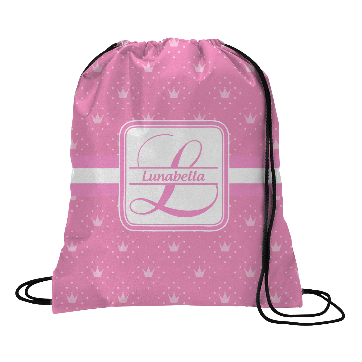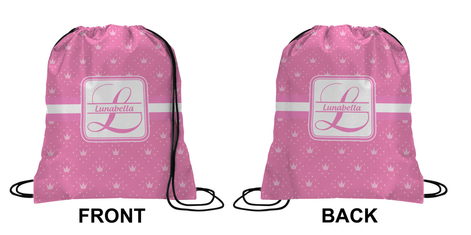 Your custom design will appear on the front and the back of the backpack. You can customize each side individually. The inside of the backpack is white and the drawstrings are black. The back pack is made of 100% polyester fabric.