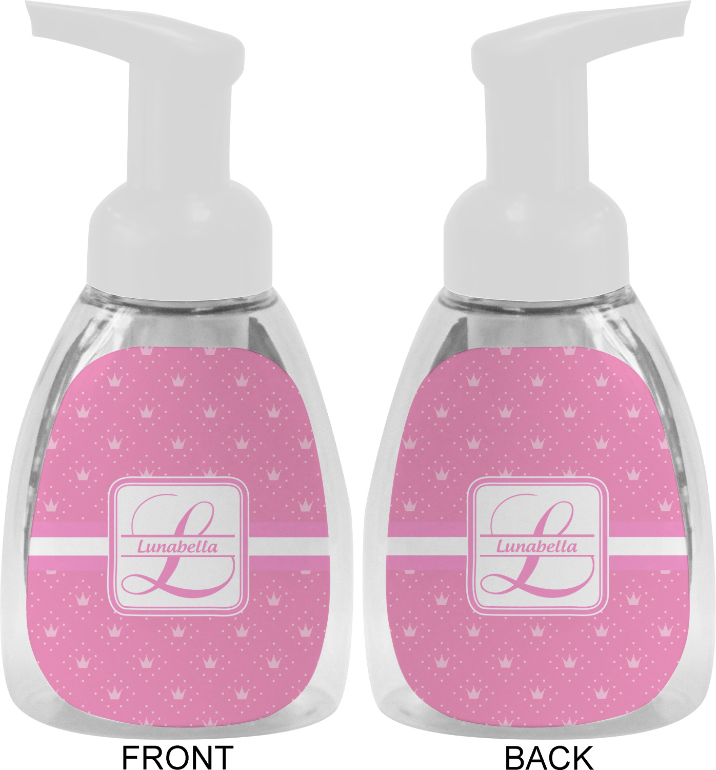 This soap dispenser is made of a robust plastic and has a clear base. The included soap pump is available in black or white color. This dispenser is 6.5 inches tall, 3 inches wide, and 2 inches deep. We display your customized designs on the front and back sides of these foaming hand soap dispensers.