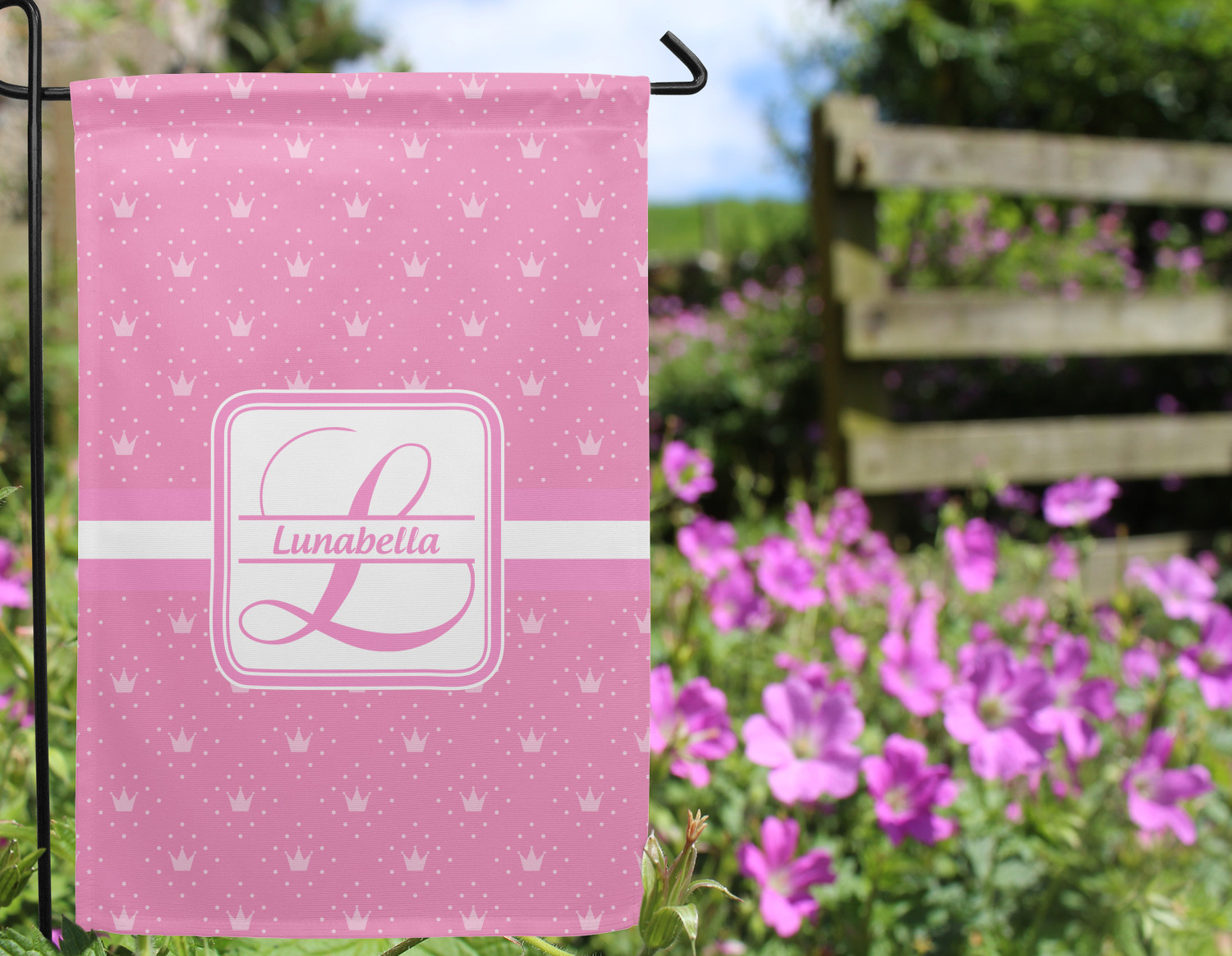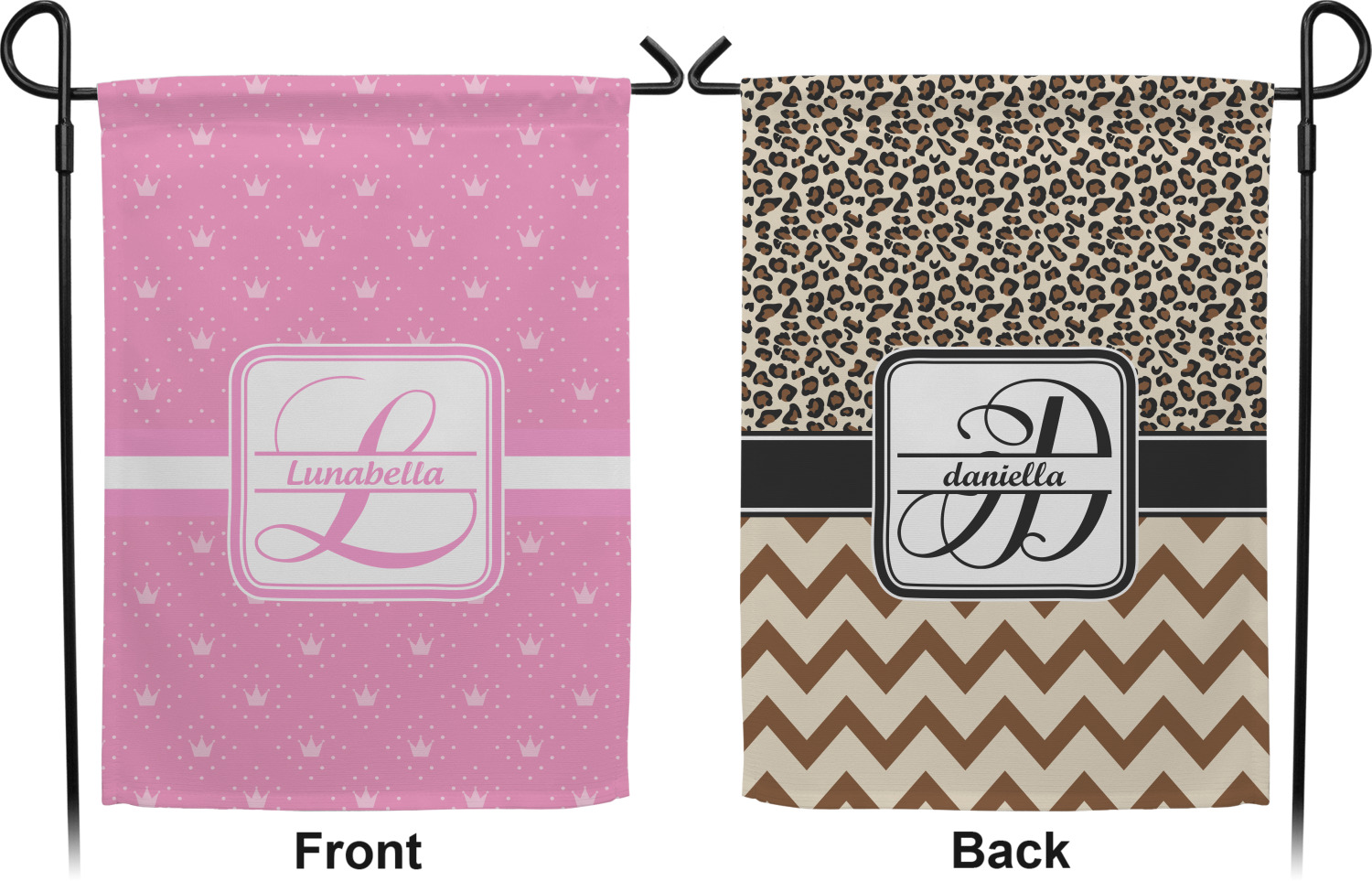These custom garden flags are made of a durable, double-ply, polyester weave, allowing them to withstand the elements year round. The small flags measure at approximately 12 by 18 inches. The large flags measure out to 28 by 37 inches. You can order these decorative flags with your customization printed on the front only, or the front and back.
